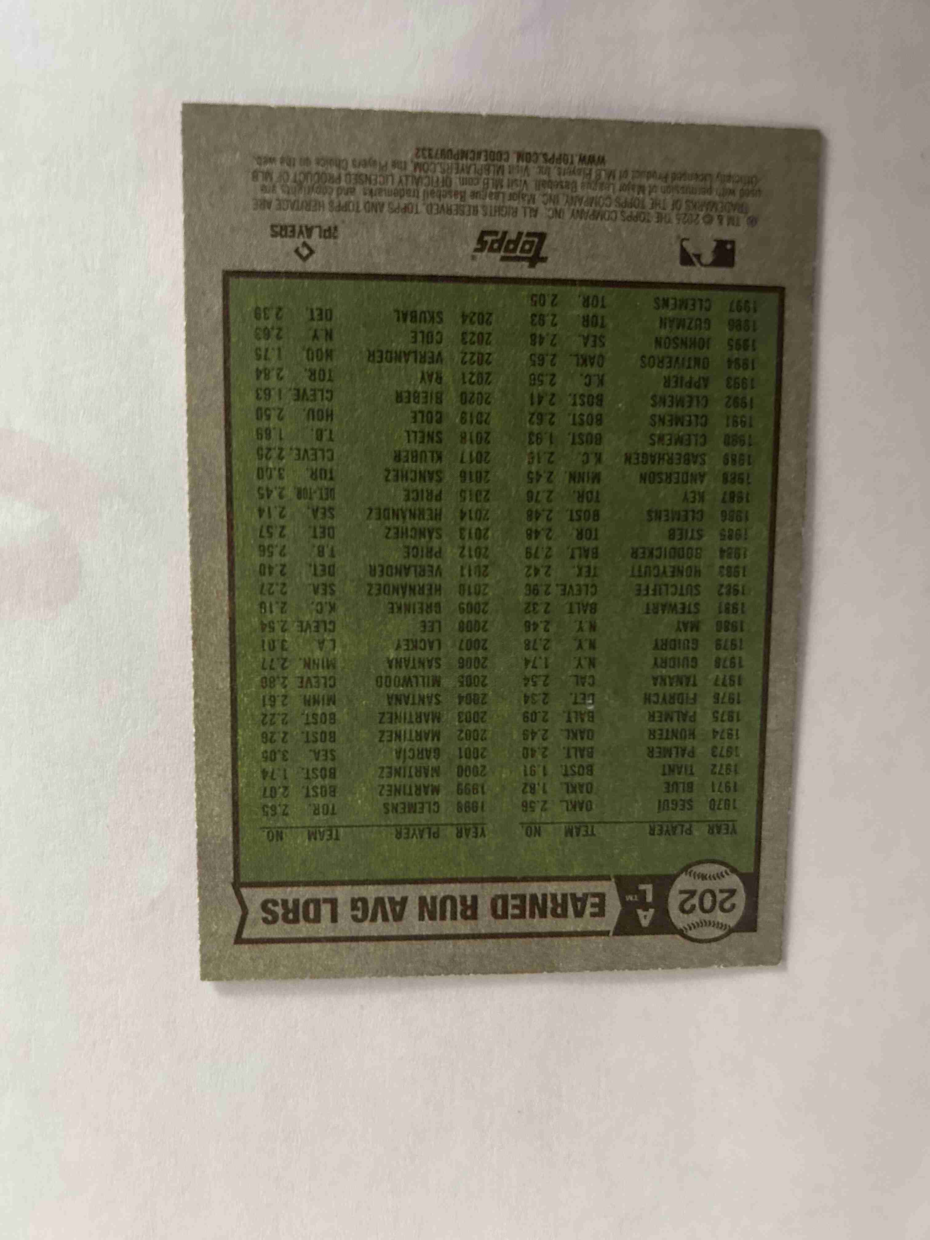This auction features a 2025 Topps Heritage earned run average leaders (American League)#202. The players are Tarik Skubal, Ronel Blanco and Framber Valdez.
