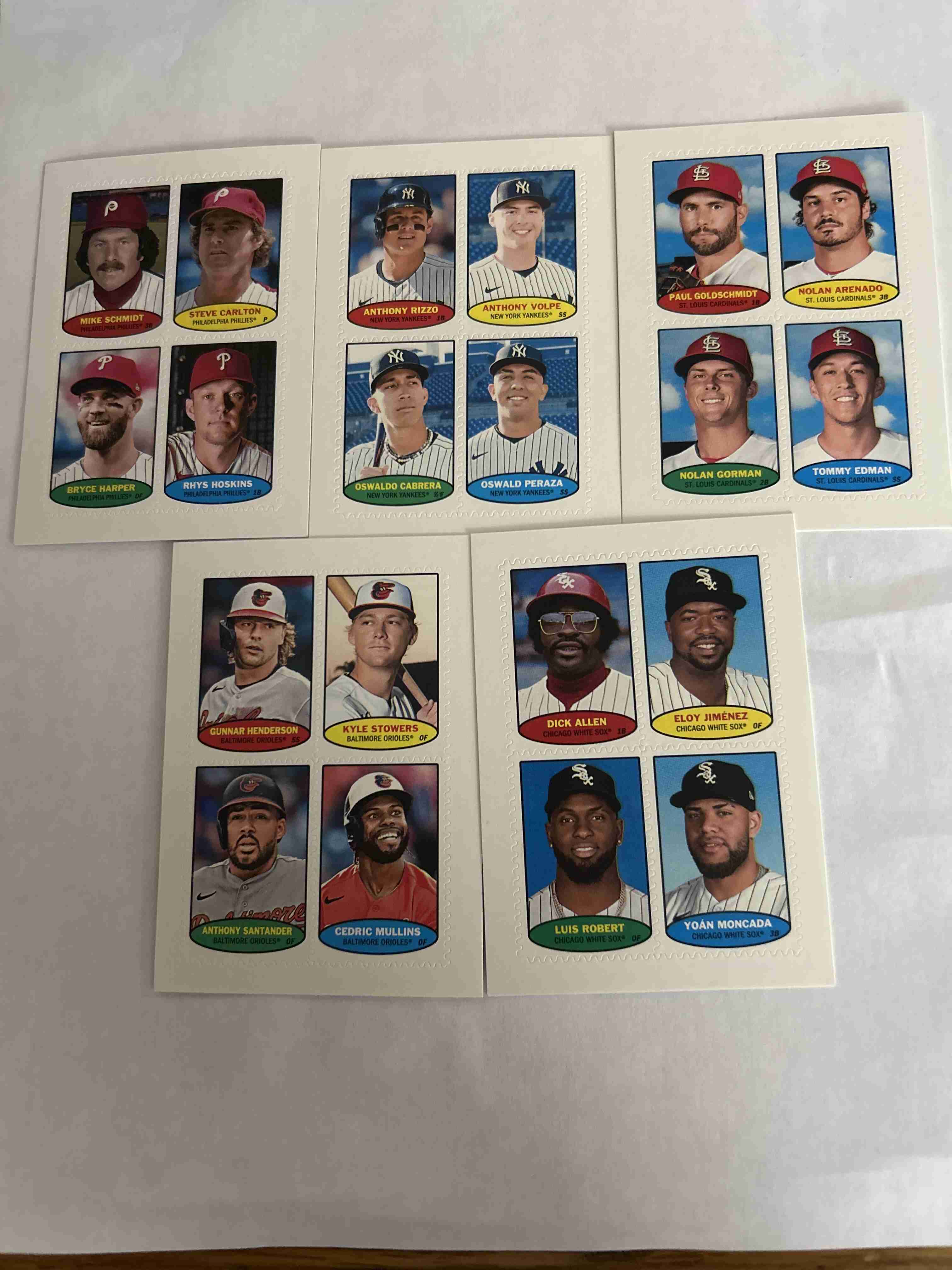 The item up for bidding is a Lot of 5- 2023 Topps Heritage (1974 stamps). There are 4 players on each card, 1 per stamp. Check out the players as you analyze the pictures. They have have Gunnar Henderson and Luis Robert etc……