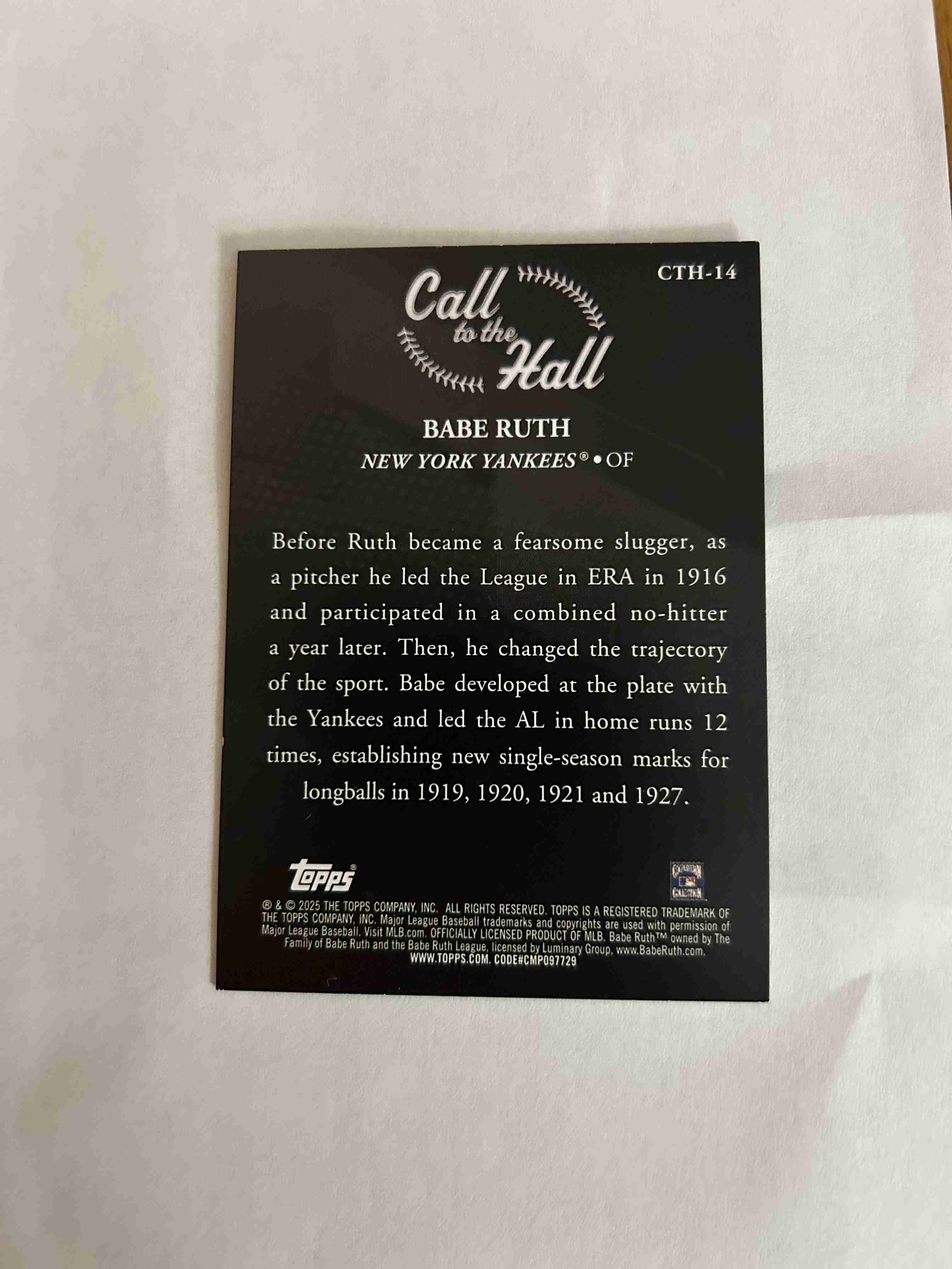 The card in this auction is a 2025 Topps Babe Ruth cth-14 call to the hall.
