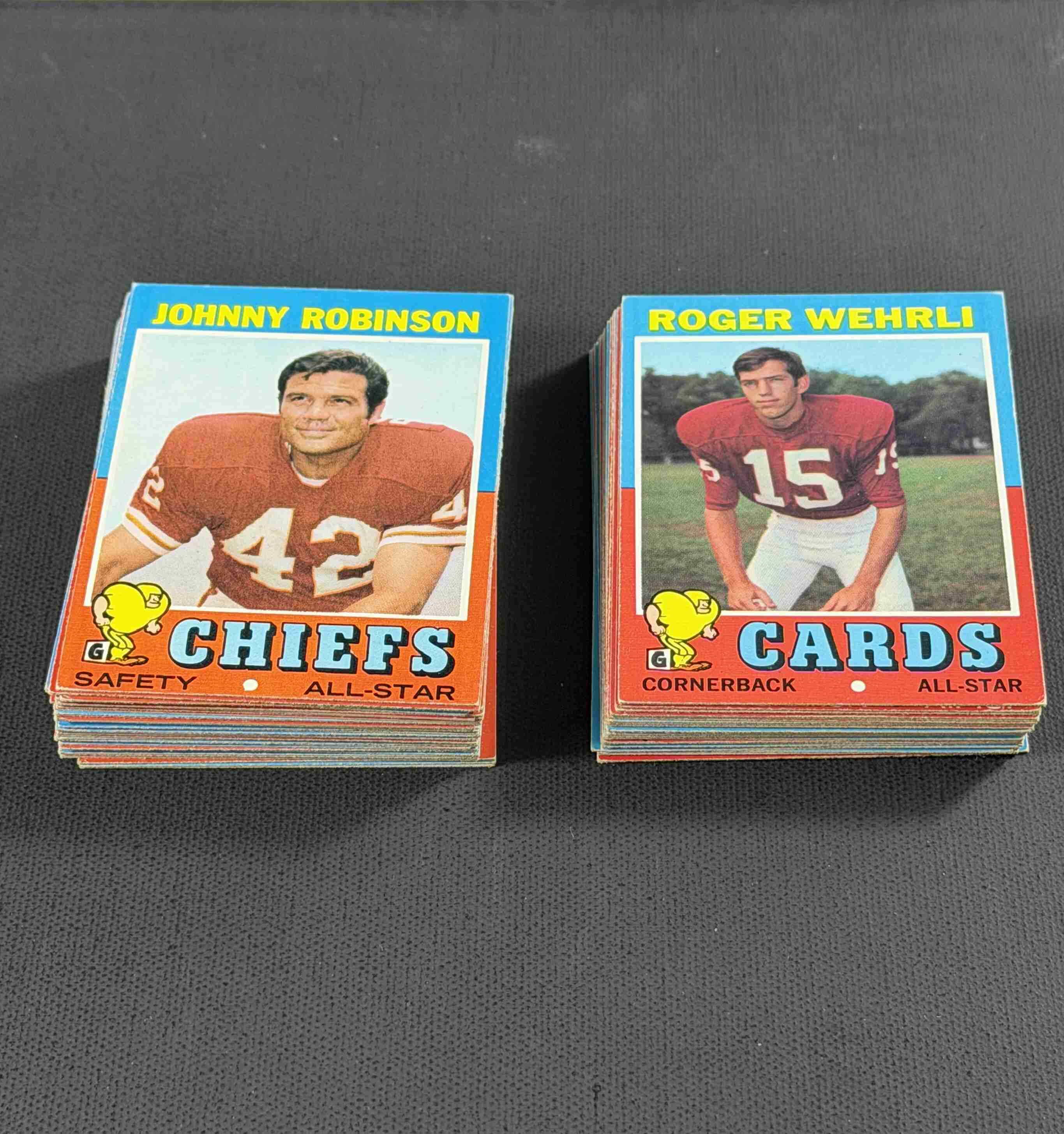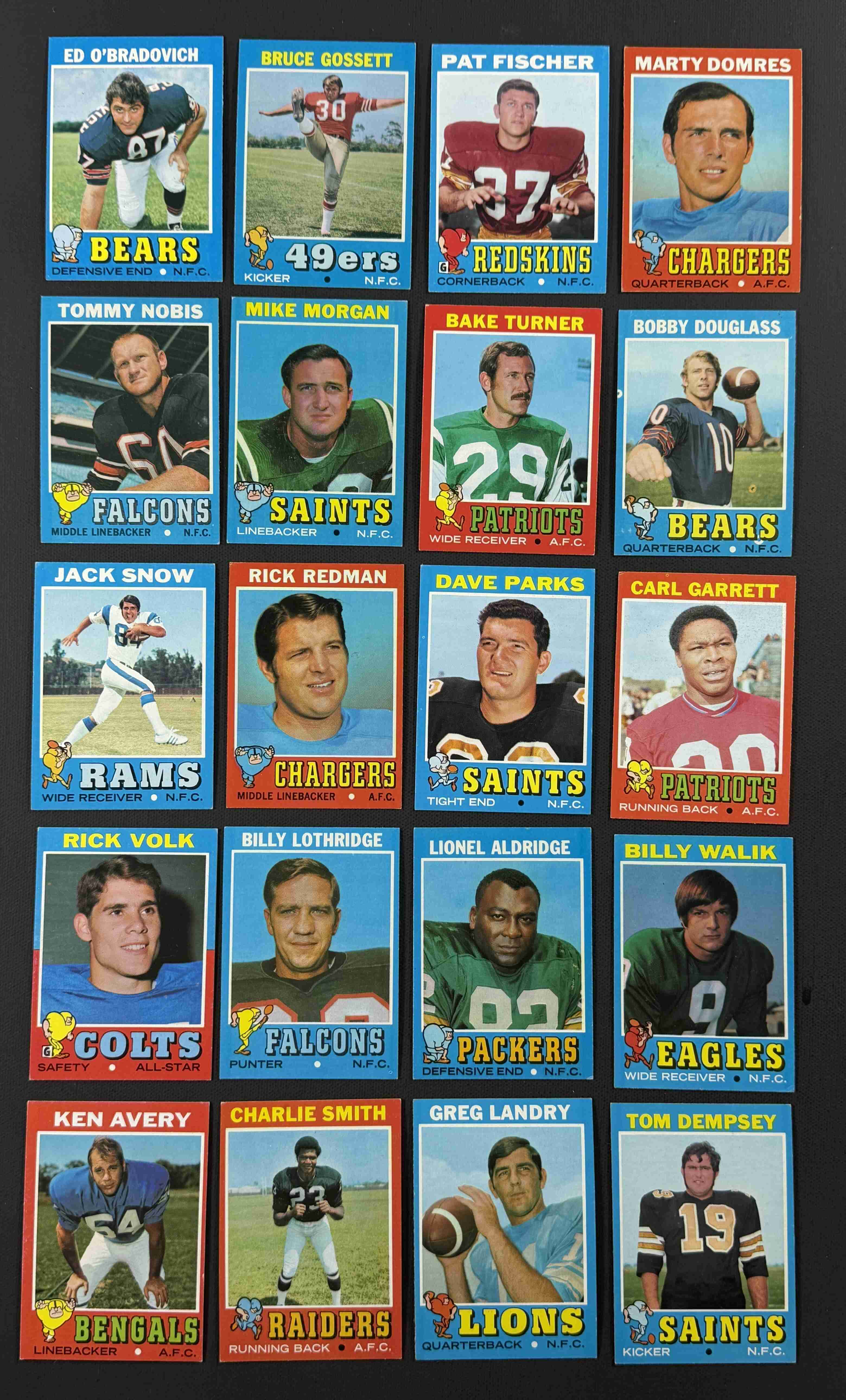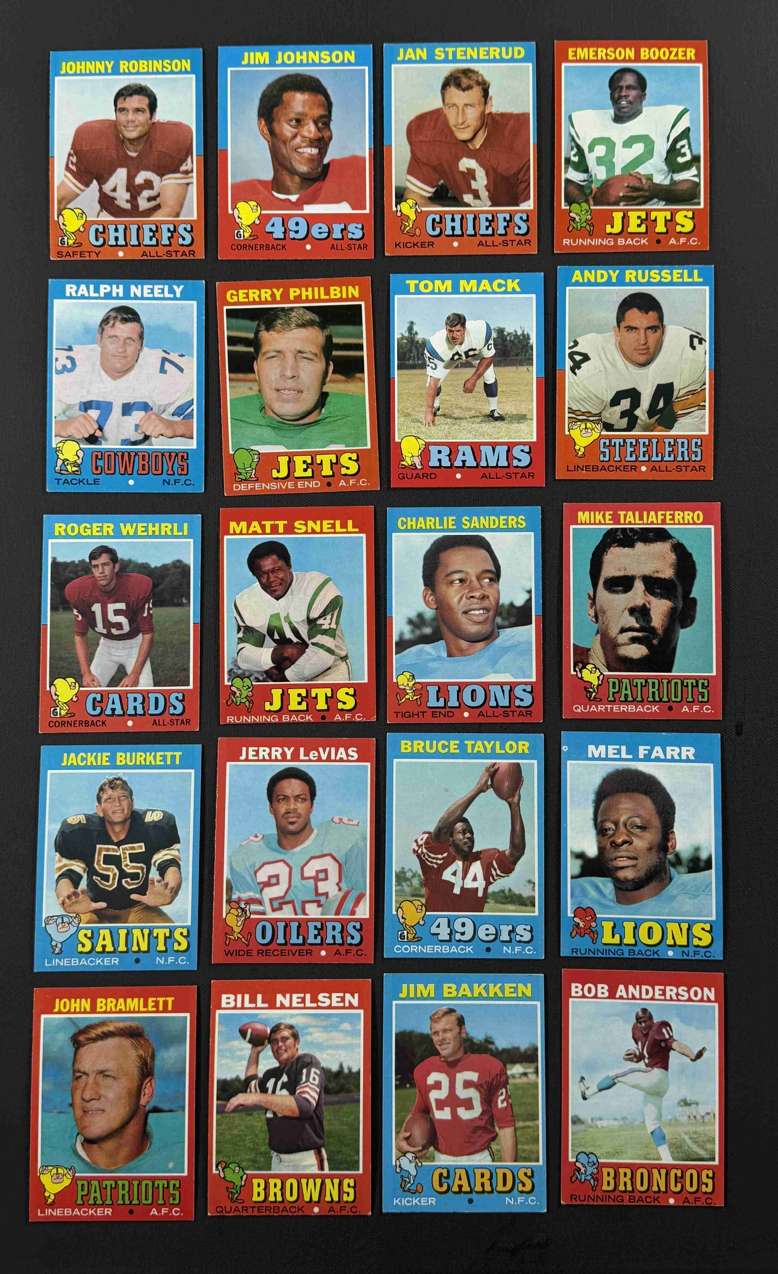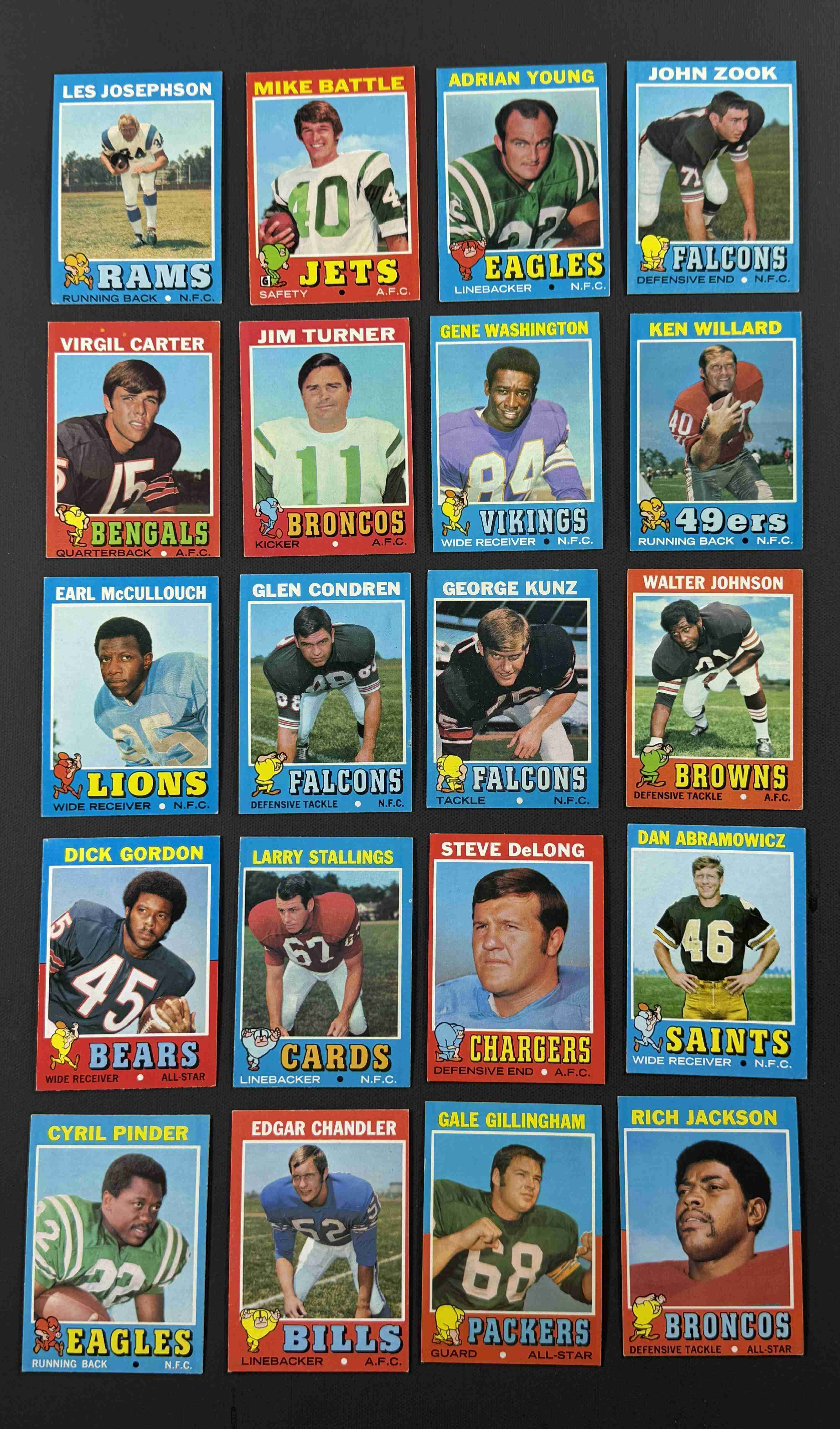 60 different 1971 Topps football in higher grade. Condition ranges from EX to NM with the overall condition being EX-MT. A few HOFers. All cards pictured.