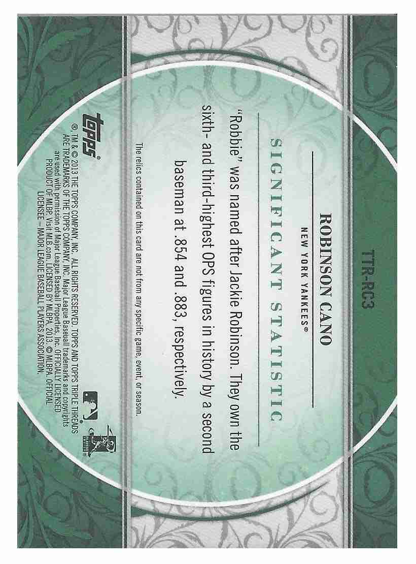 Yankees' Robinson Cano 2013 Triple Threads Relics Emerald - SN 14/18. Card will be shipped via USPS Ground Advantage in a bubble mailer. Thanks for looking.