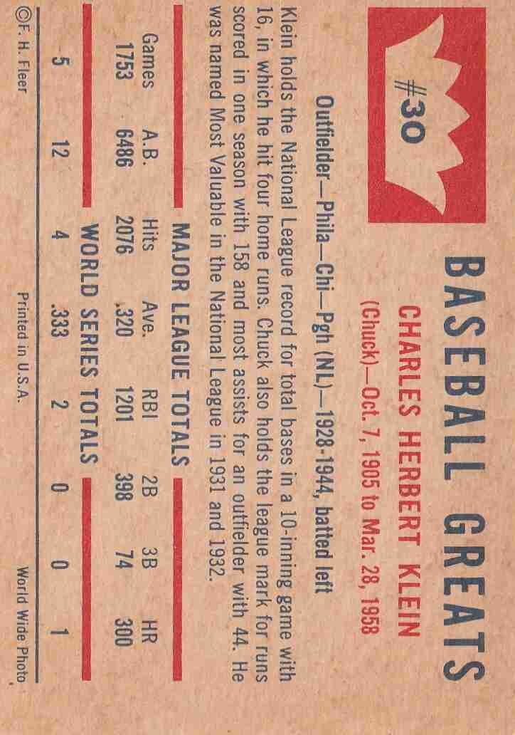 1960 Fleer Baseball Greats - Chuck Klein #30