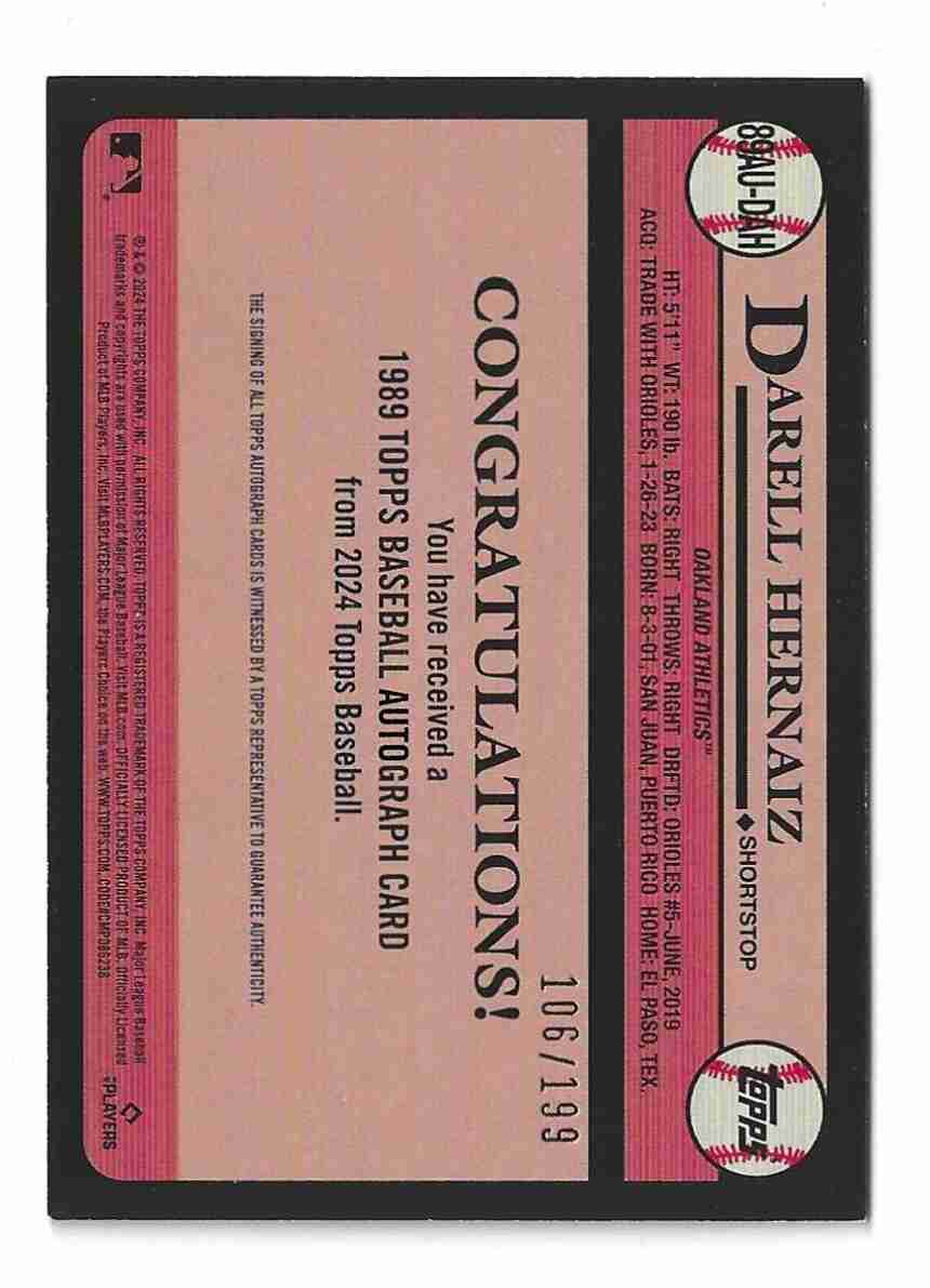 Hernaiz 2024 Topps '89 Topps Black Auto. Serial numbered 106/199. Card number 89AU-DAH in the set. Mailed in a standard envelope. Thanks for bidding!