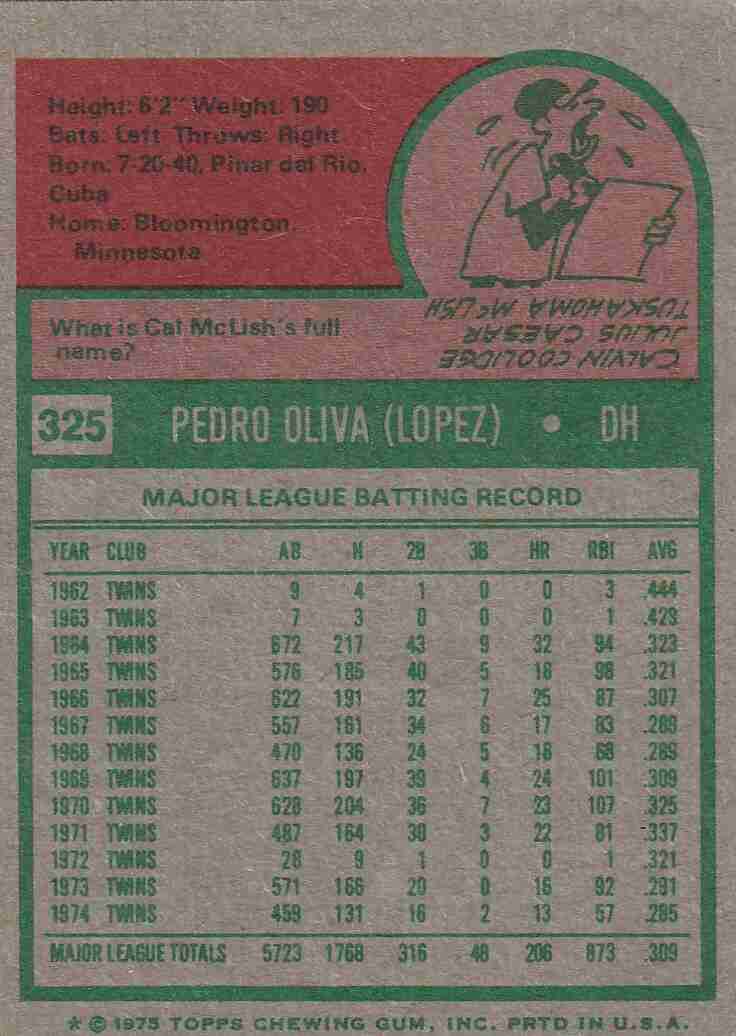 1975 Topps #325 Tony Oliva Twins