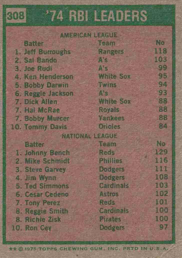1975 Topps # 308 '74 RBI Leaders Bench-Burroughs