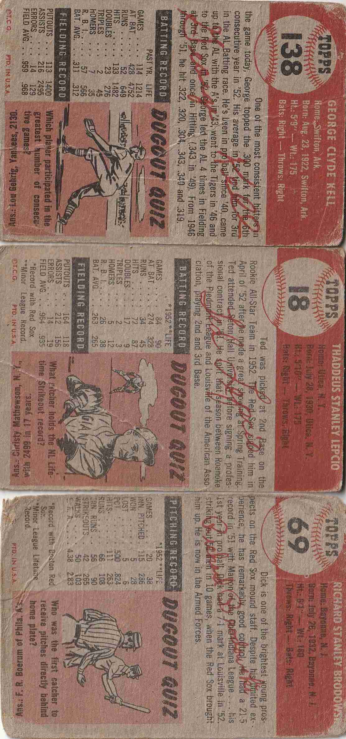 3-1953 Topps Red Sox #'s 18 69 138 (lower grade)