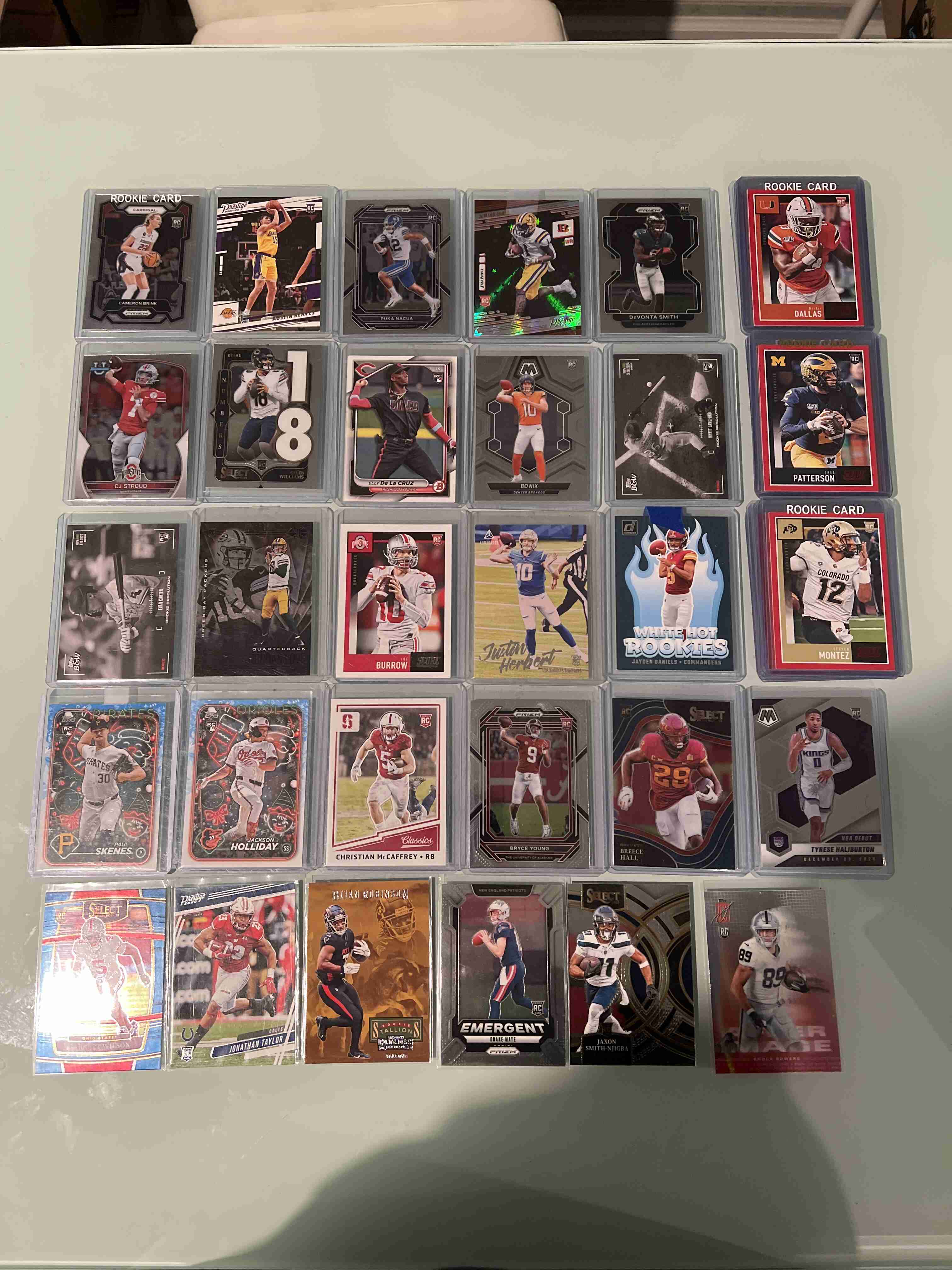 Up for your consideration is a (100) card lot: included in here are RC's jersey cards, autos, in person autos, (6) PSA 10 cards, #ED CARDS, inserts... names like Maye, Nix, Skenes, Cruz, love, Burrow.... you'll receive everything pictured.