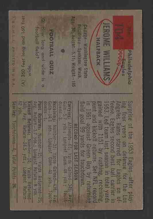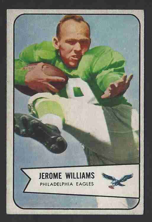1954 Bowman Jerome Williams -#104- Eagles. This is a high-grade card. Card has minor flaws - nice corners. Nice shape for this era. Ships no tracking. Please review scans carefully for condition.
