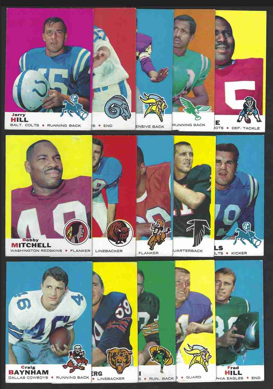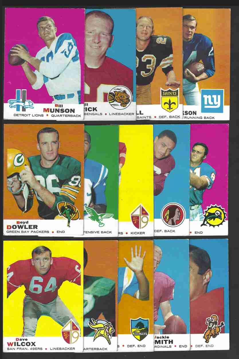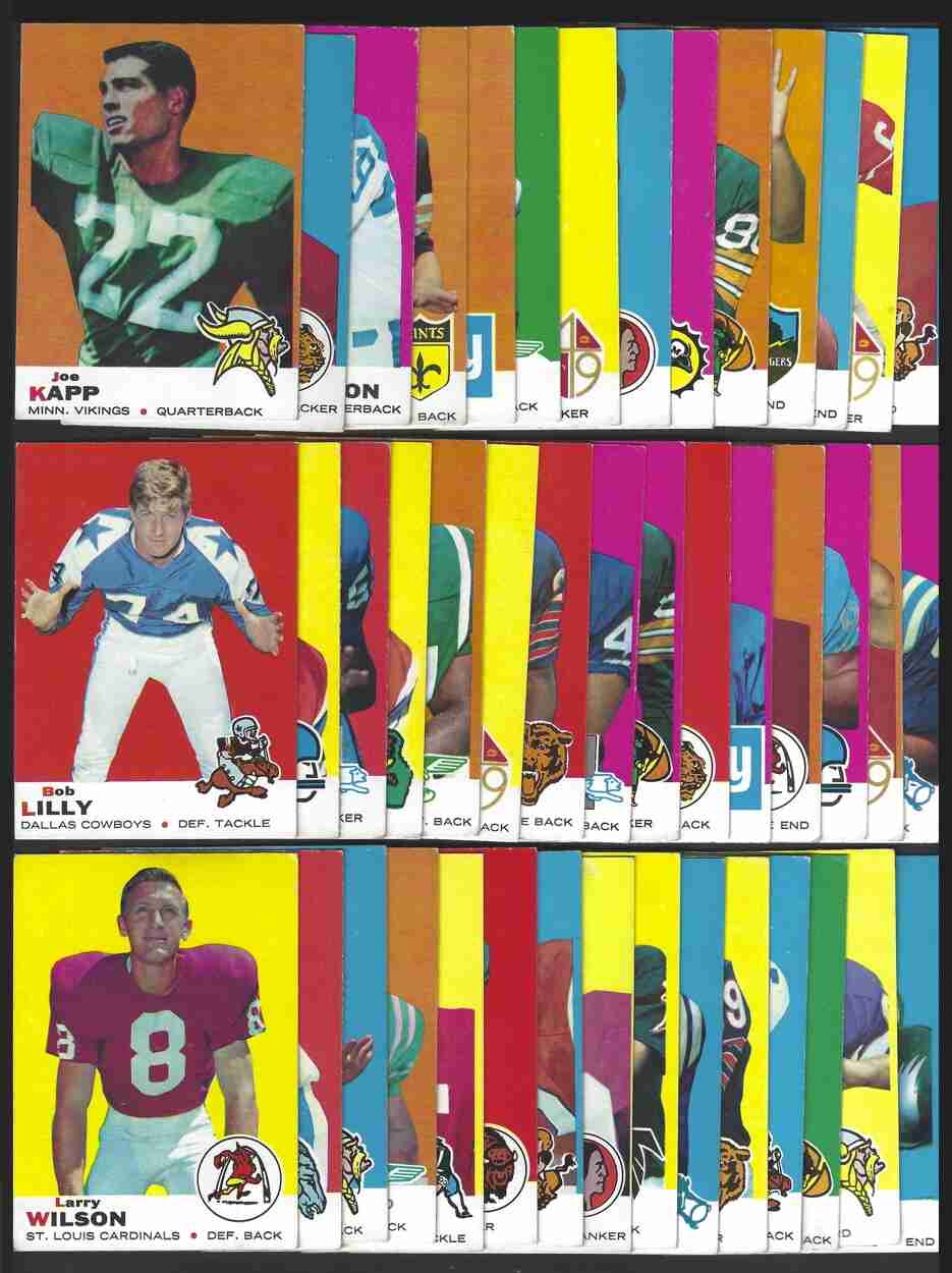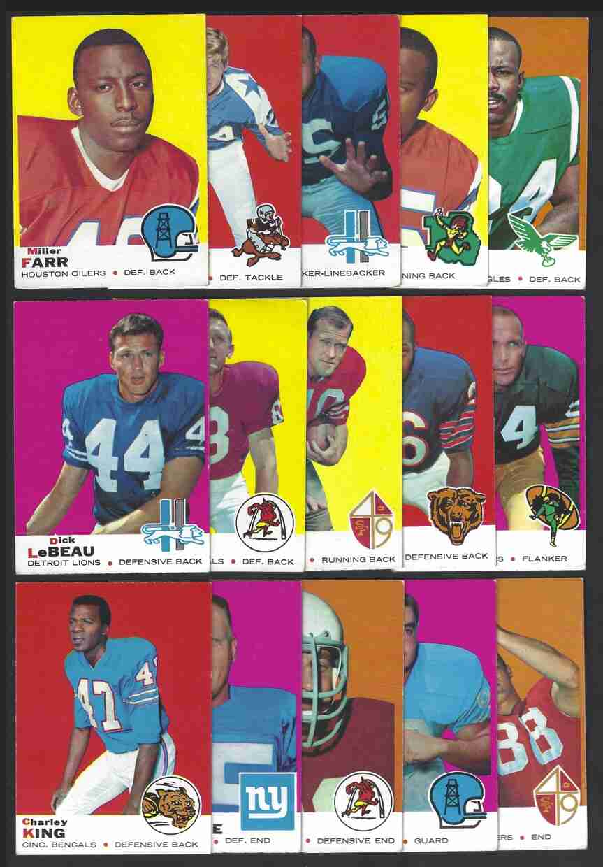 1969 Topps Football Lot (44) -Series I-. No's-9,11,14,15,16,22,23,28,33,35, 38,43(HOF),44(HOF),49,50,53(HOF),54,58,63,65(HOF),66,73,76(HOF),77,79,84,87, 88,91,94,103,104,107,108,109,110,114(HOF),115,116,117,122,124,126,130. Excellent large lot of 1969 Series I Football cards. Most of the cards in this lot are in the higher-grade range. Cards have minor flaws - many with nice corners. Nice shape for this condition-sensitive set. Nice lot! Please review scans carefully for condition.