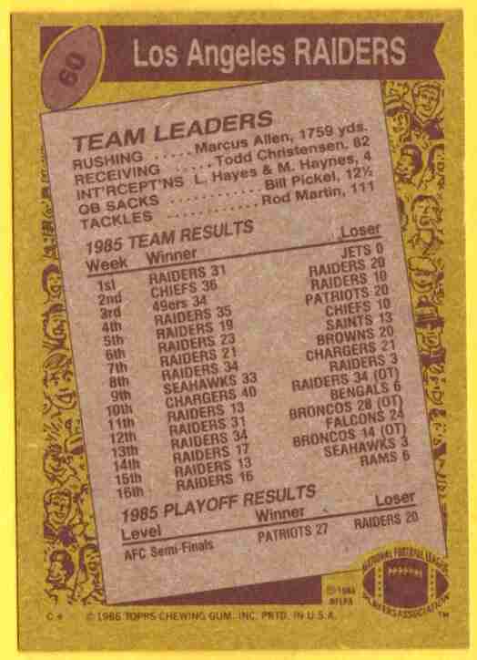 Raiders Team [Marcus Allen] #60 1986 Topps