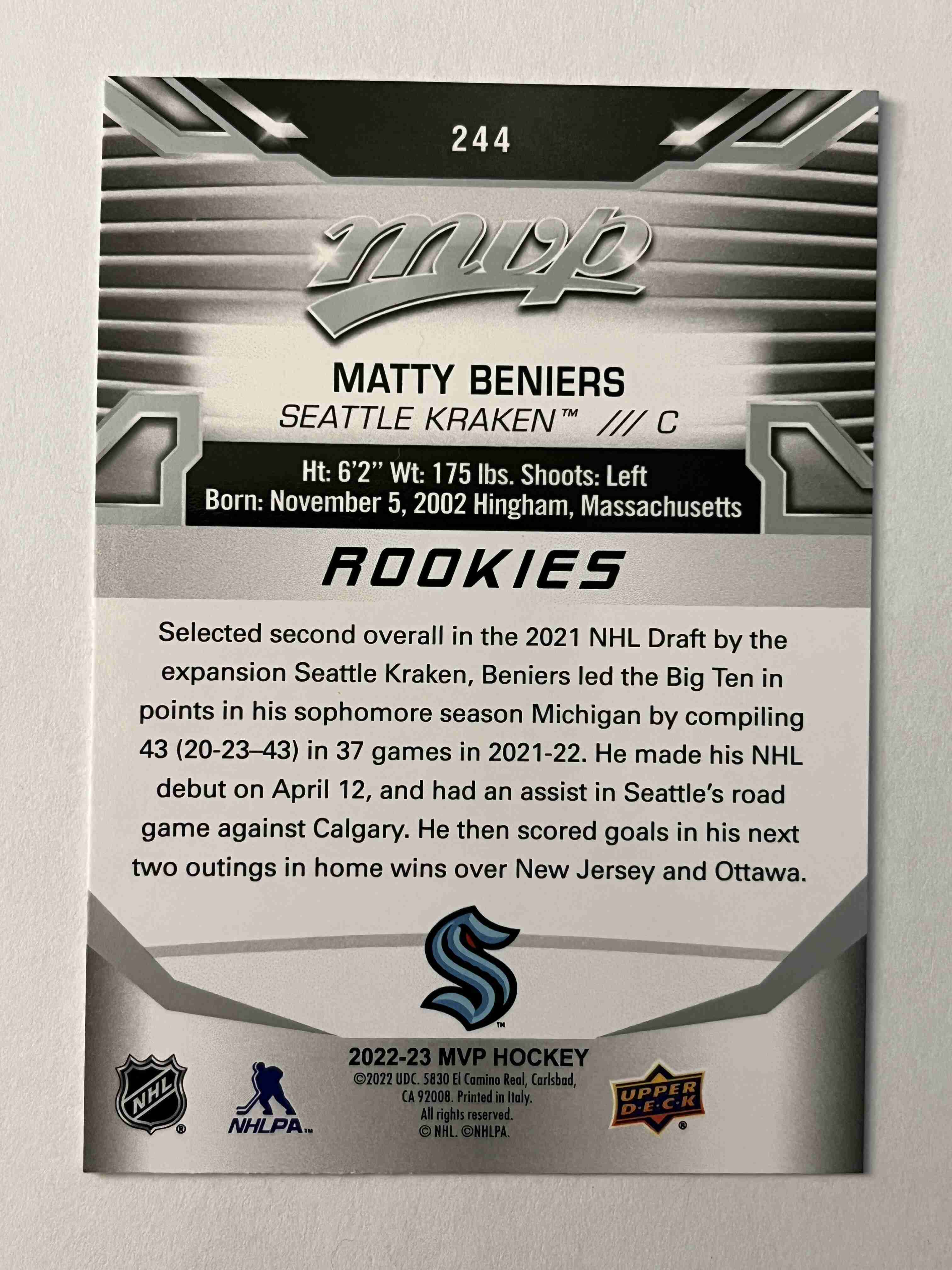 Matty Beniers 2022-23 MVP Rookies RC Silver Script #244