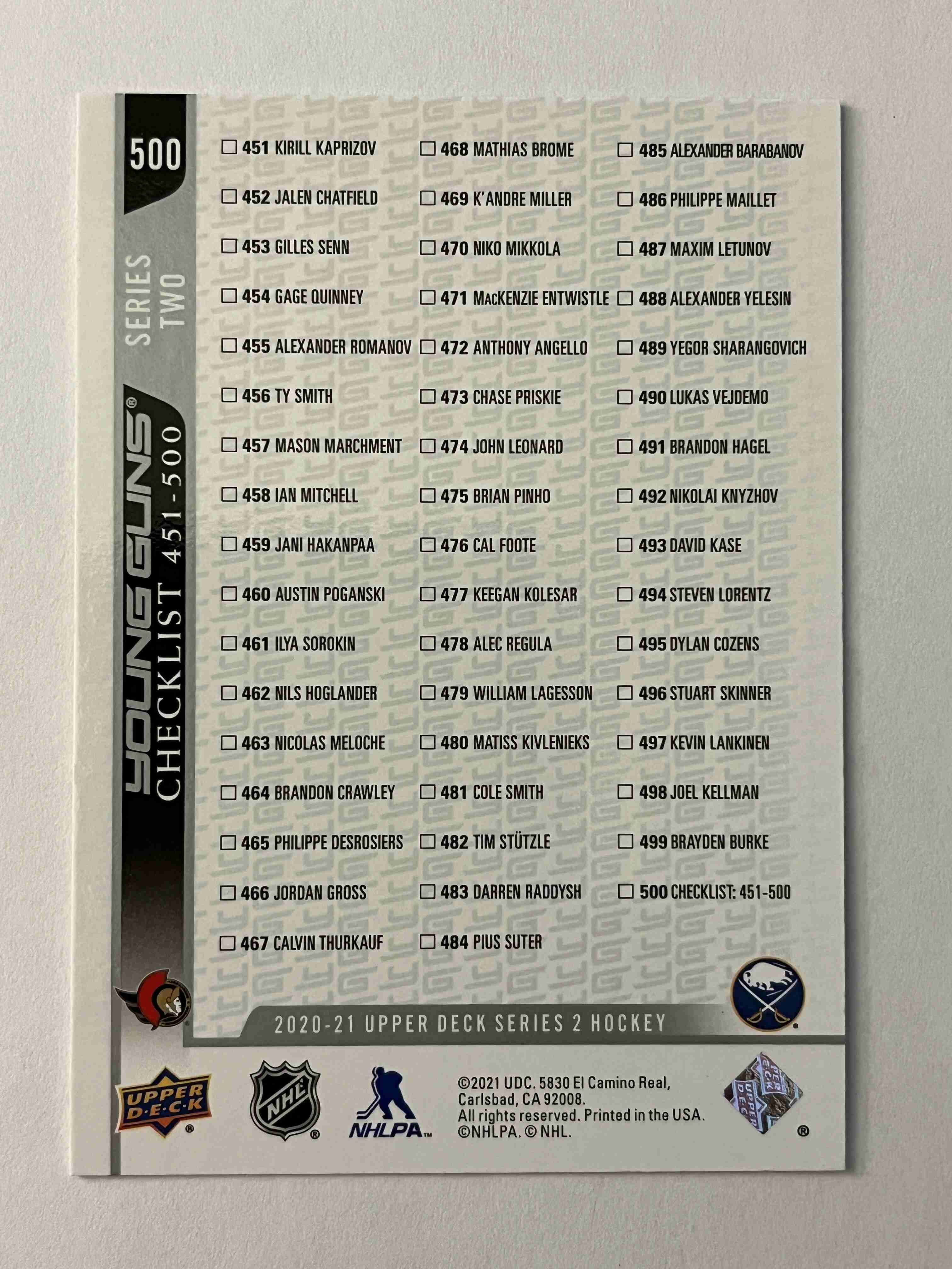 Tim Stutzle / Dylan Cozens 2020-21 UD Young Guns Checklist