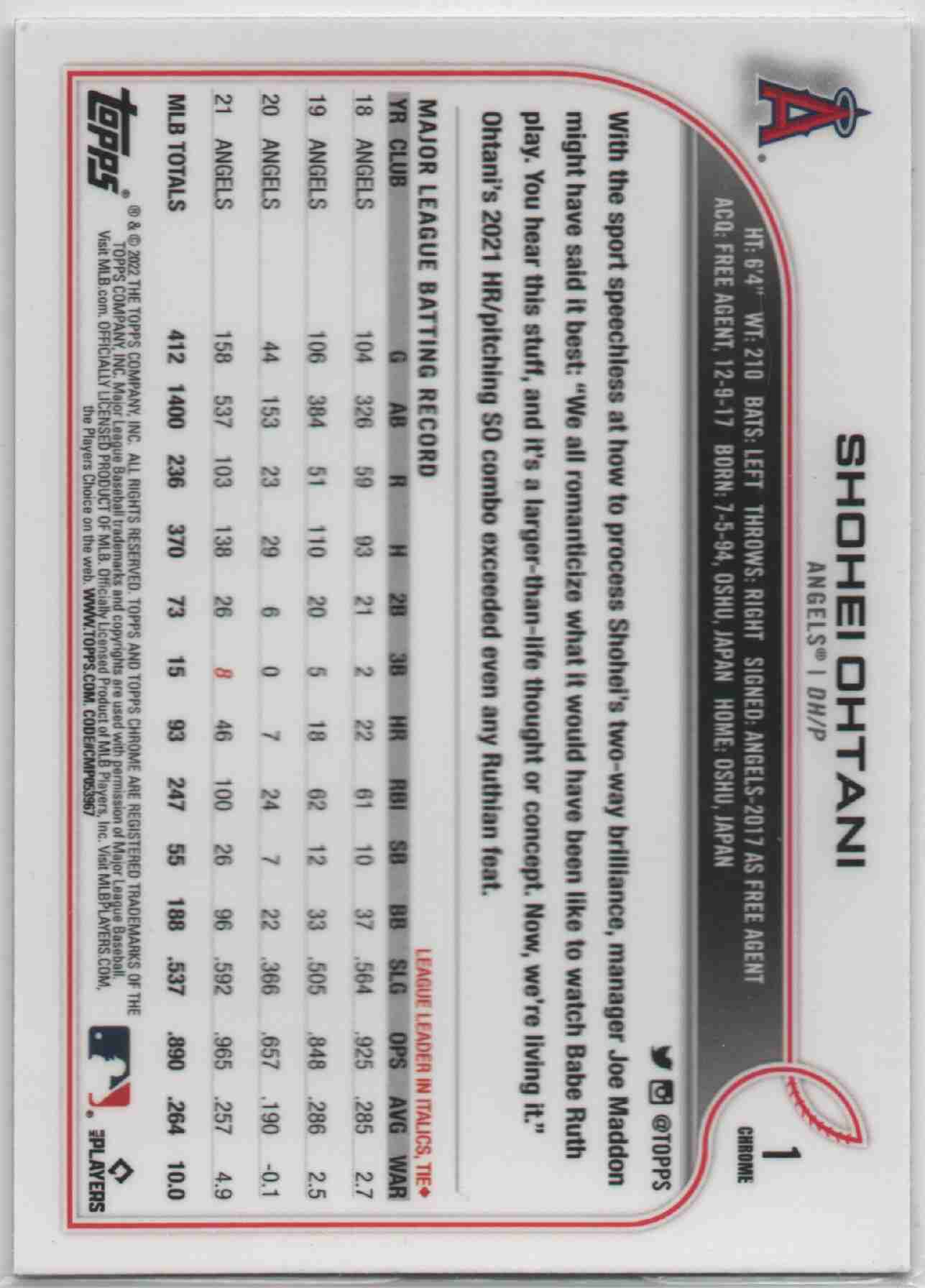 Shohei Ohtani 2022 Topps Chrome #1 Base