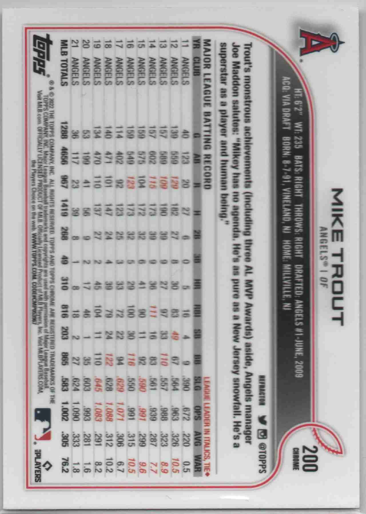 Mike Trout 2022 Topps Chrome #200 Refractor