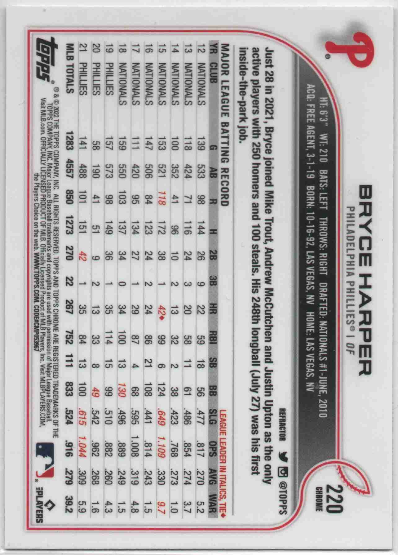 Bryce Harper 2022 Topps Chrome #220 Refractor