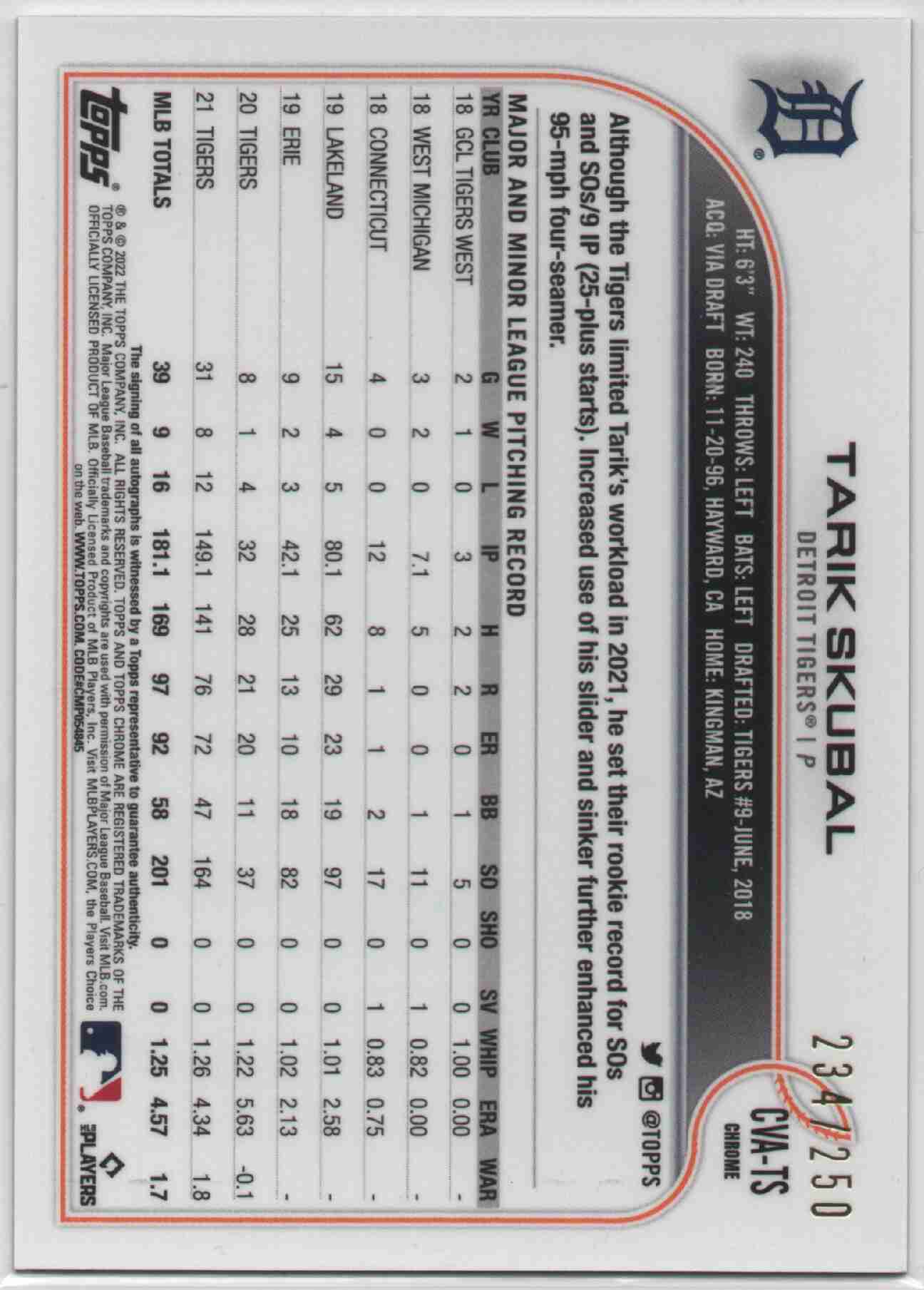 Tarik Skubal 2022 Topps Chrome Purple Refractor AUTO /250