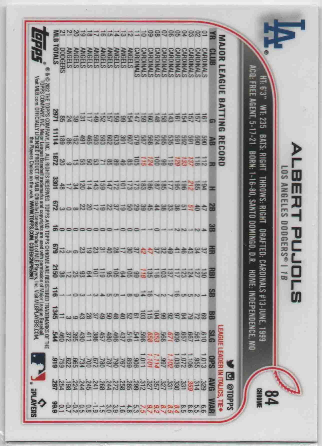 Albert Pujols 2022 Topps Chrome #84 Xfractor