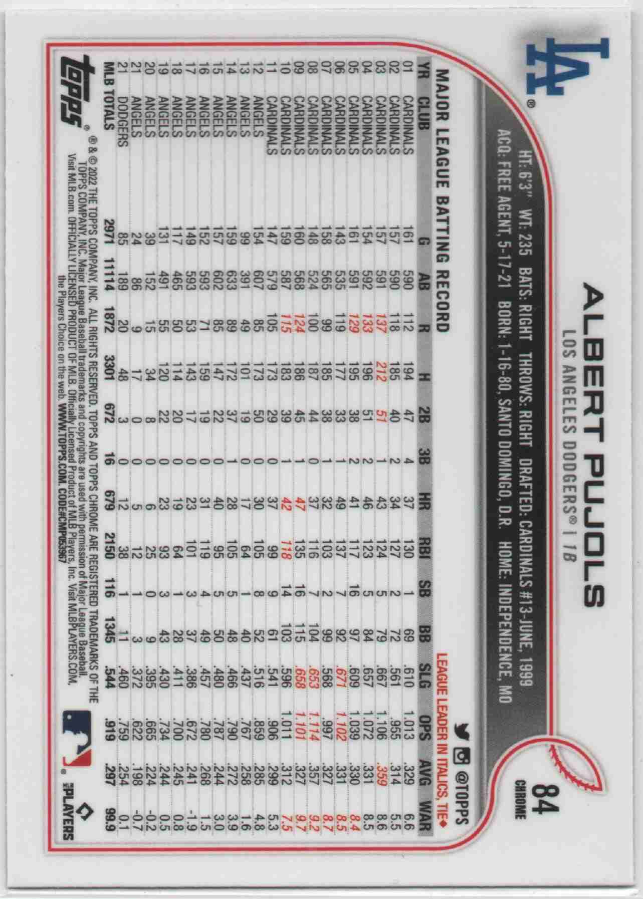 Albert Pujols 2022 Topps Chrome #84 Sepia Refractor