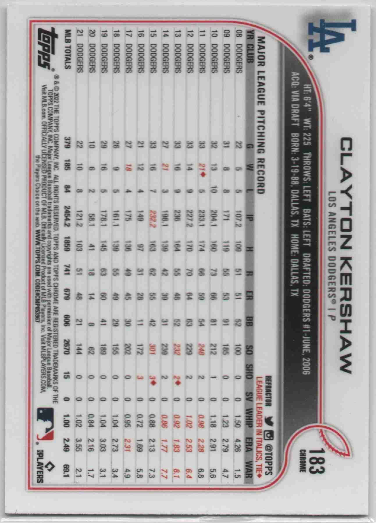 Clayton Kershaw 2022 Topps Chrome #183 Refractor