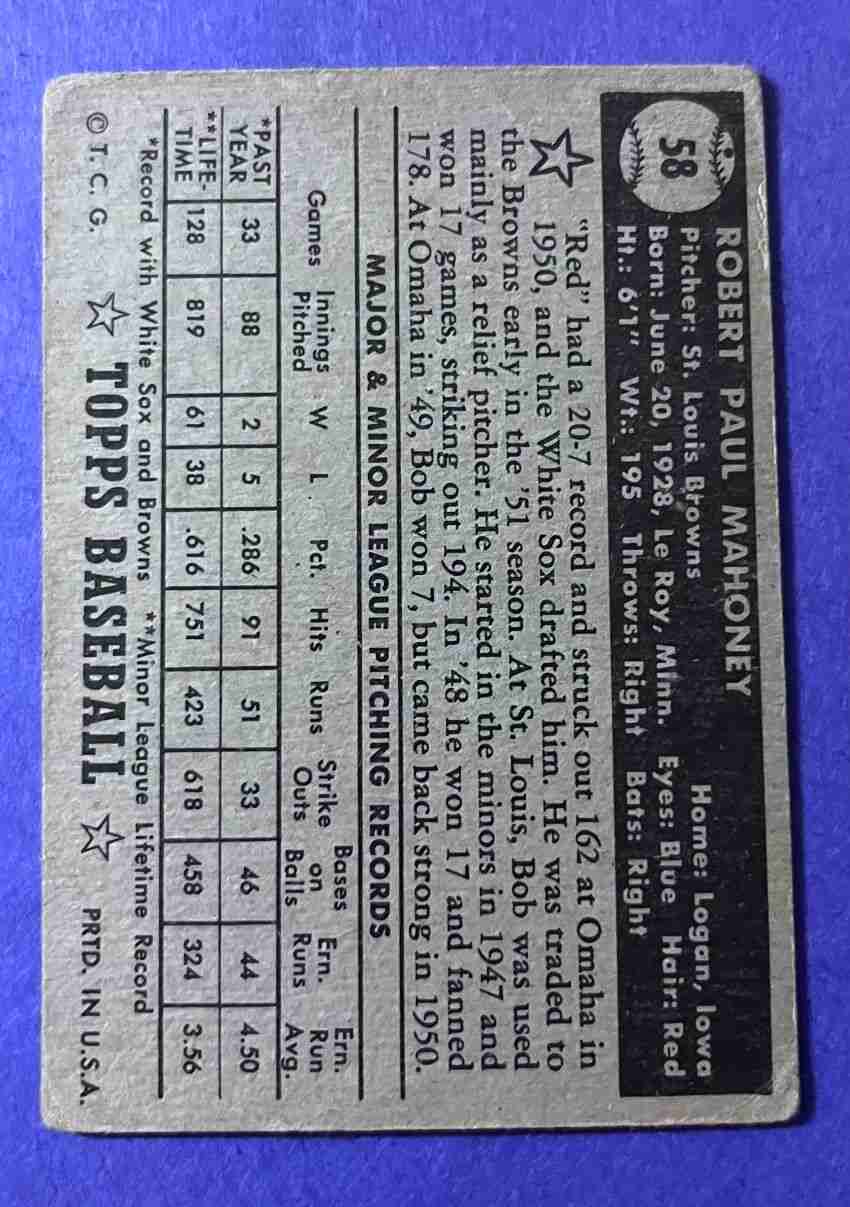 52 Topps BOB MAHONEY RC Lo #58 +++