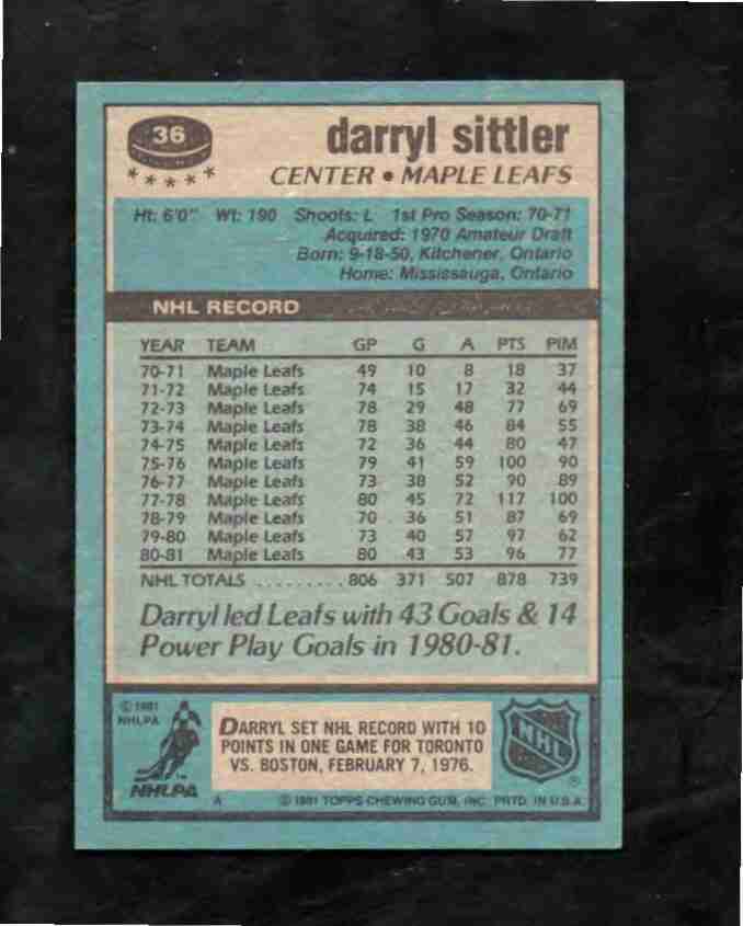 1981/82 Topps # 36 HOFer DARRYL SITTLER Maple Leafs