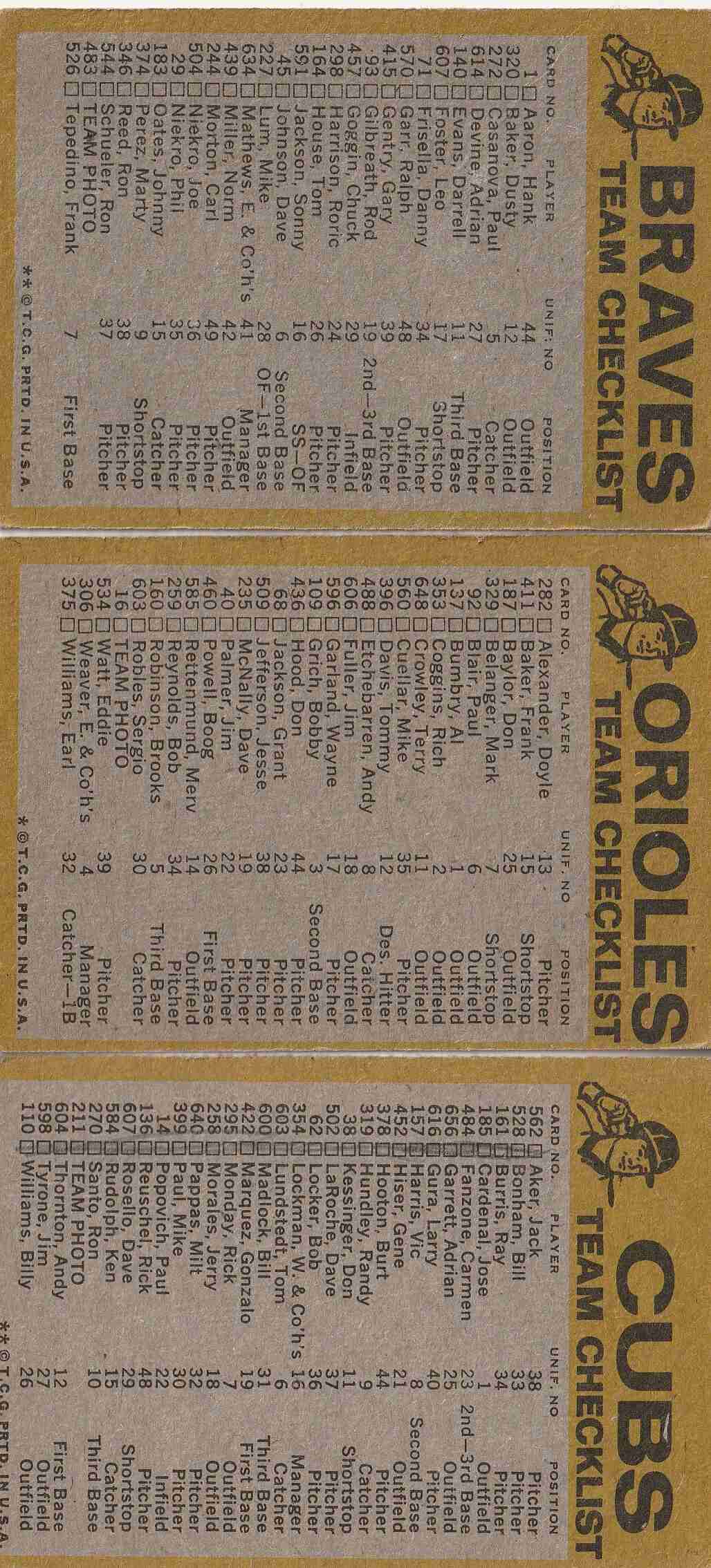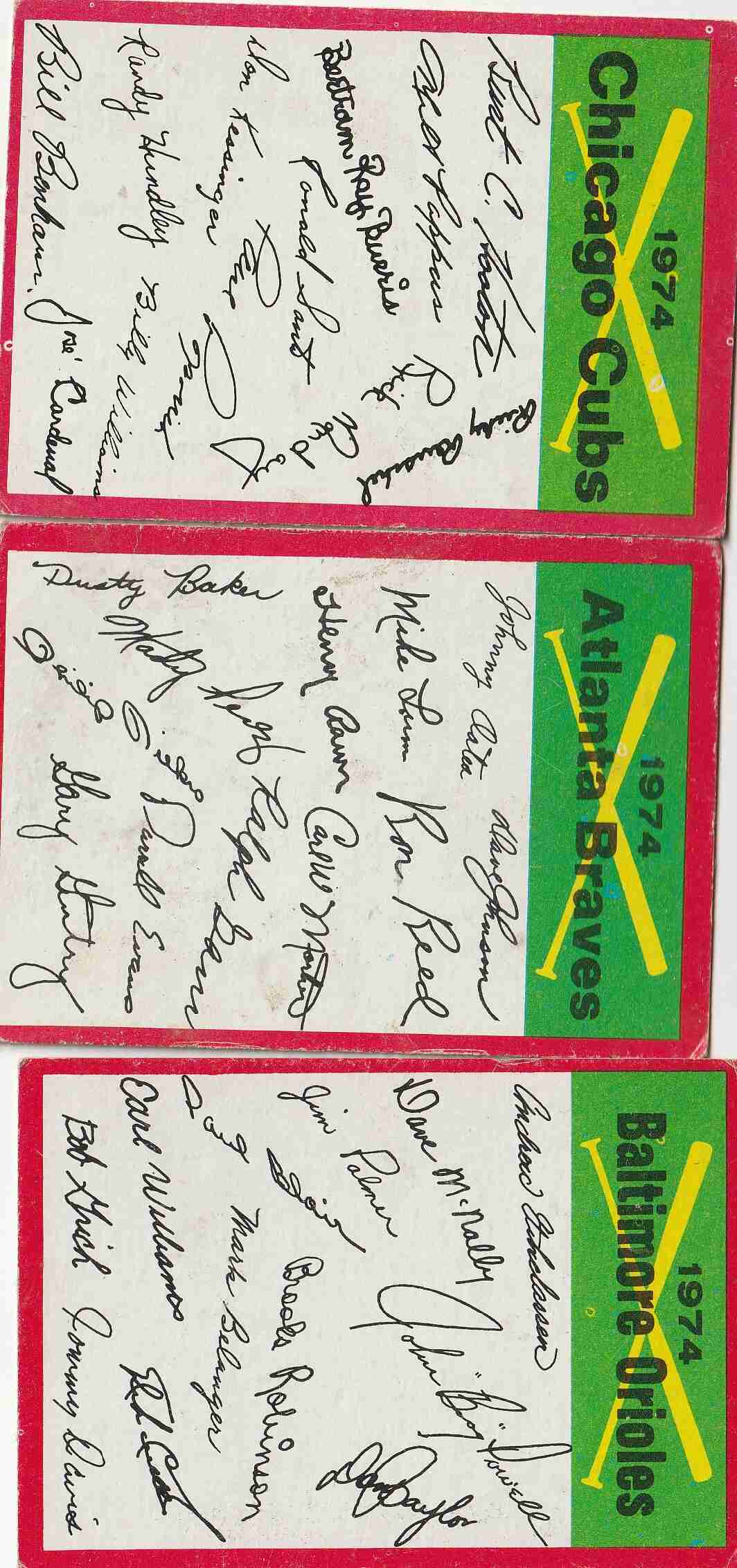 1974 Checklists Braves Cubs Orioles (VG+_/EX) corner wear 1975 TC #'s 146 216 236 246 304 361 487 531 (EX) average