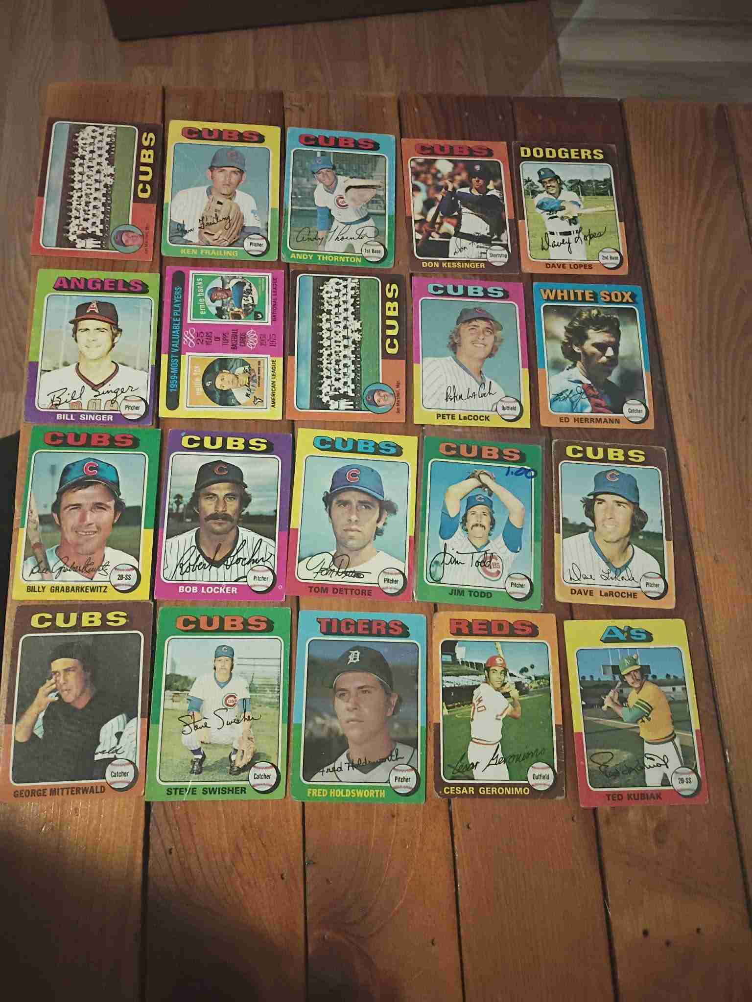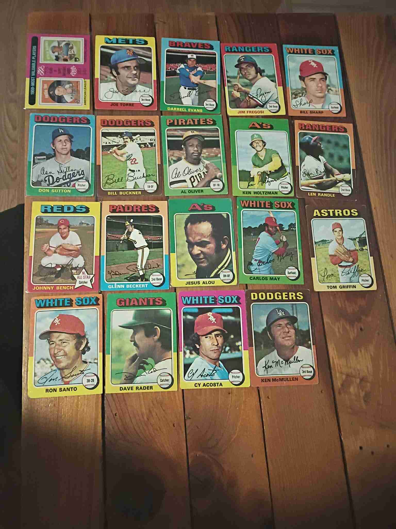 (39) 1975 Topps with Johnny Bench Don Sutton Ernie Banks Ron Santo Dwight Evans Bill Buckner Jesus Alou Holtzman Torre and more