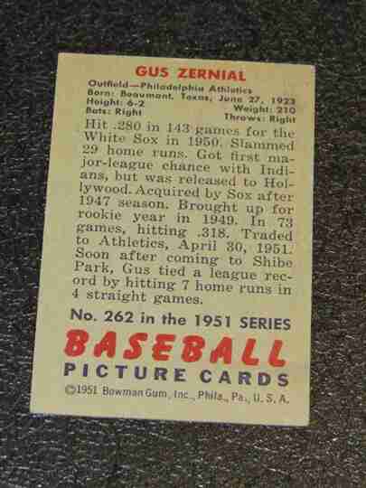1951 Bowman #262 Gus Zernial- G/VG - BV $80 Hi #