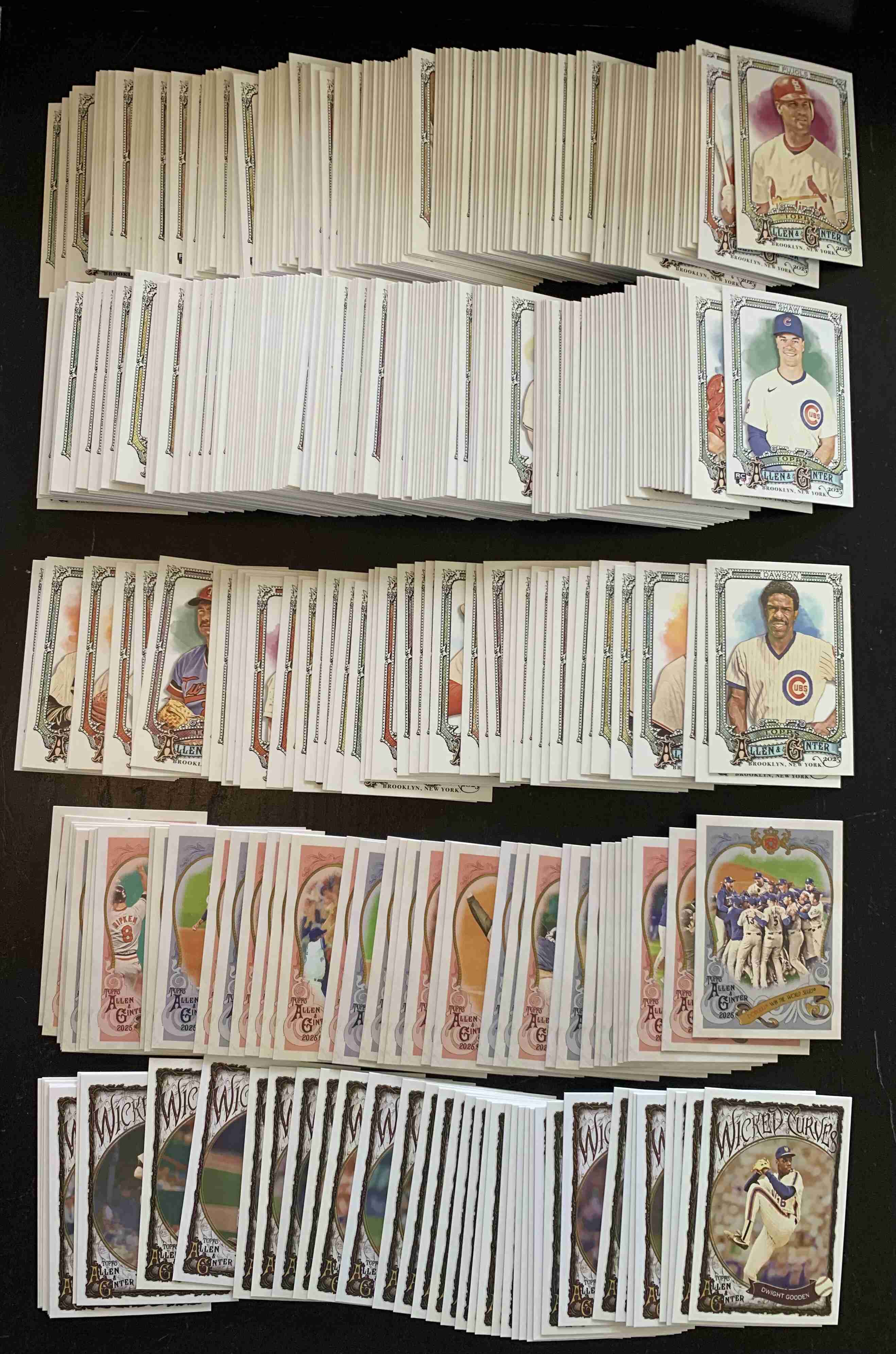 For auction is a COMPLETE 2025 Topps Allen & Ginter Full-Sized Master Set. Set includes ALL 300 Base Cards (1-300); 50 Base High Number SPs (301-350); 40 Card Sweet Victory Set (SV-1 - SV-40); and 40 Card Wicked Curves Set (WC-1 - WC-40) for 430 TOTAL Cards. Overall cards are NM or better, though there may be outliers. Please refer to photos for more details. Cards will ship securely via USPS with Tracking.