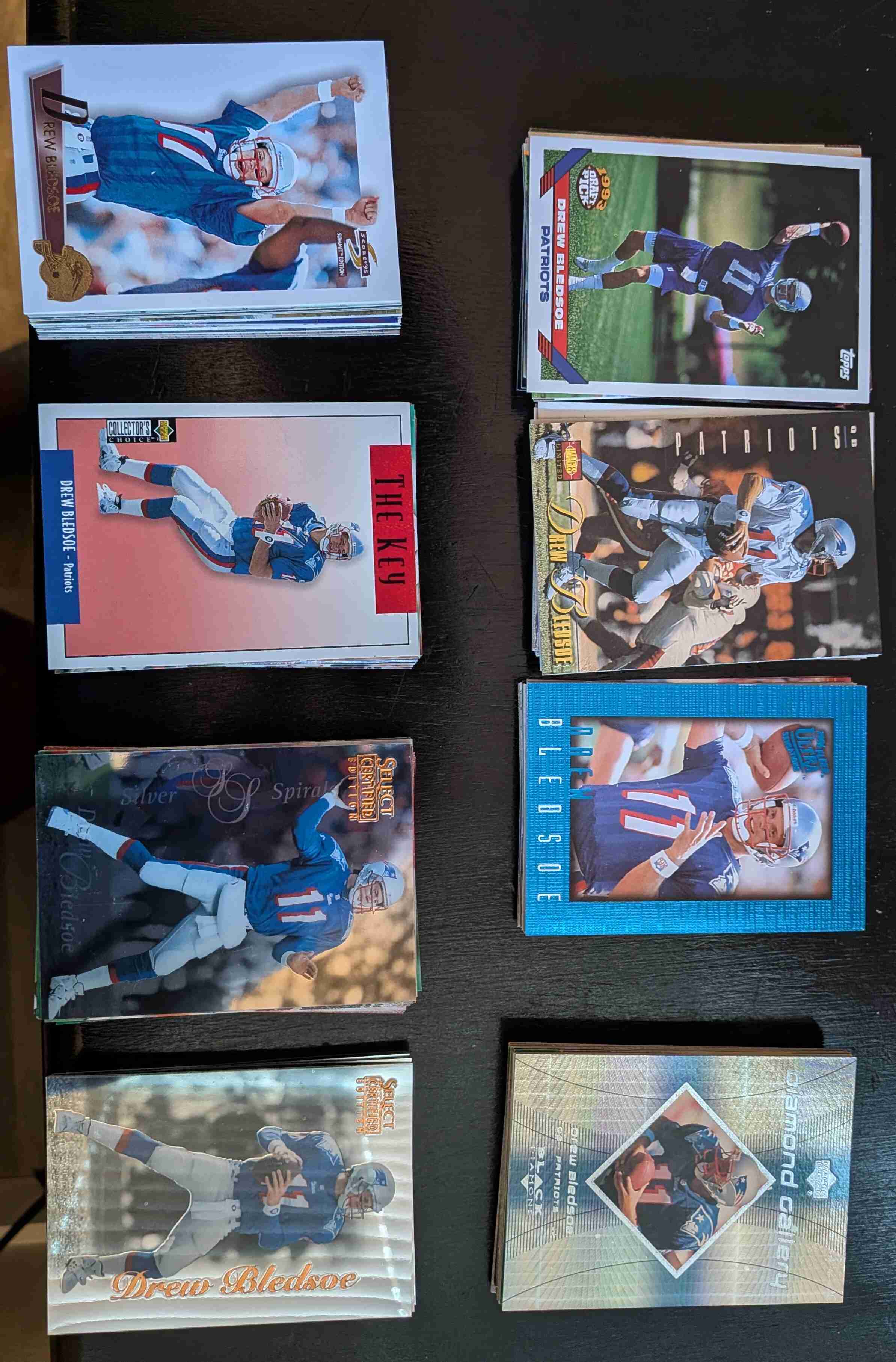 How did over 140 Drew Bledsoe cards end up in my collection? No clue. But I really don't want them any more. Please take them off of my hands. There are rookie cards, inserts, parallels, and, yes, there are duplicates. Oh yeah, there is one Steve McNair card as well. Enjoy!