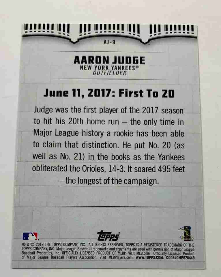 2018 Topps #AJ-9 Aaron Judge June 11, 2017 First to 20