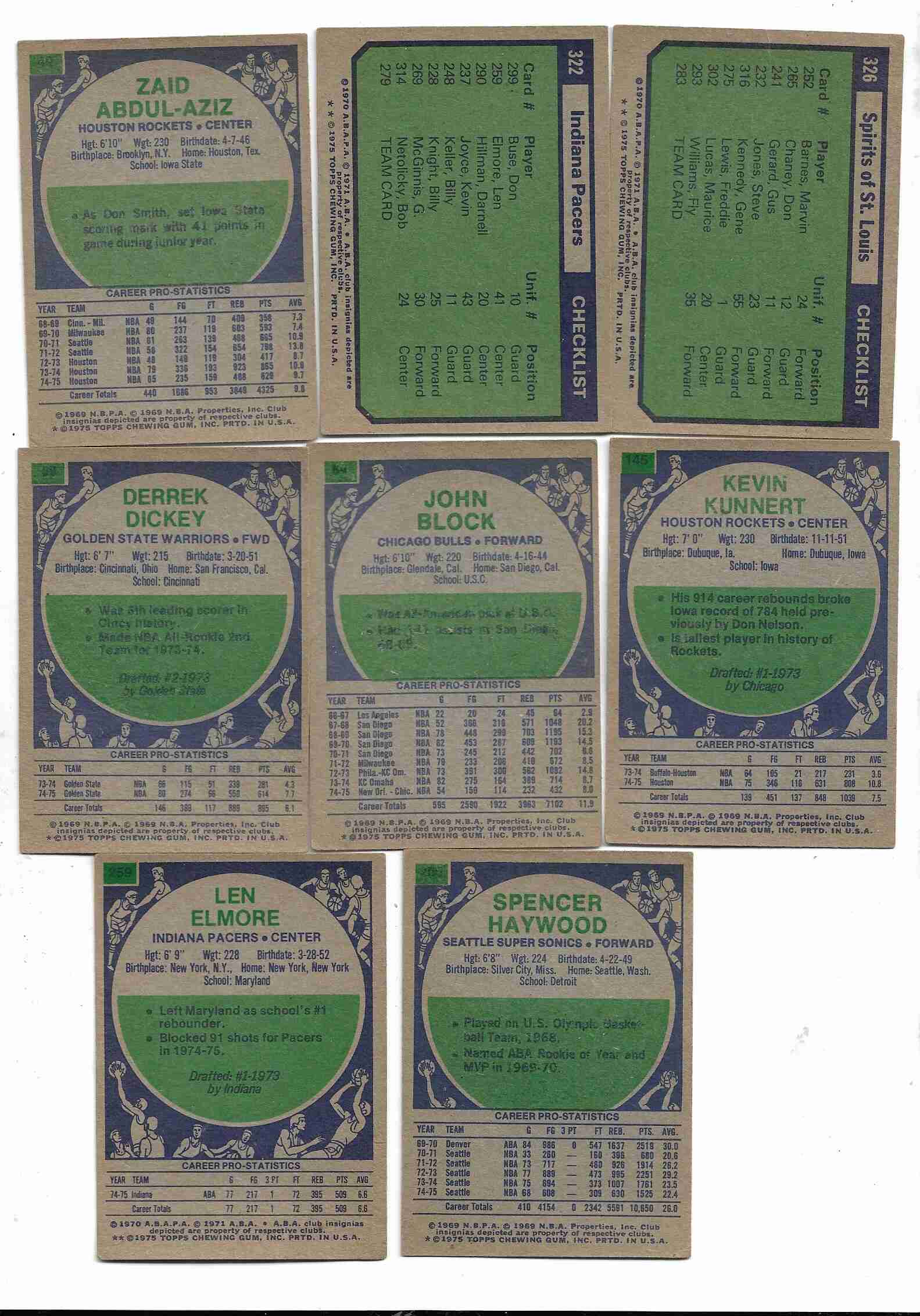 VG/EX, Zaid Abdul-Aziz, Derrek Dickey, John Block, Kevin Kunnert, Len Elmore, Spencer Haywood, Indiana Pacers Team w/Geoge McGinnis, St. Louis Spirits w/Maurice Lucas