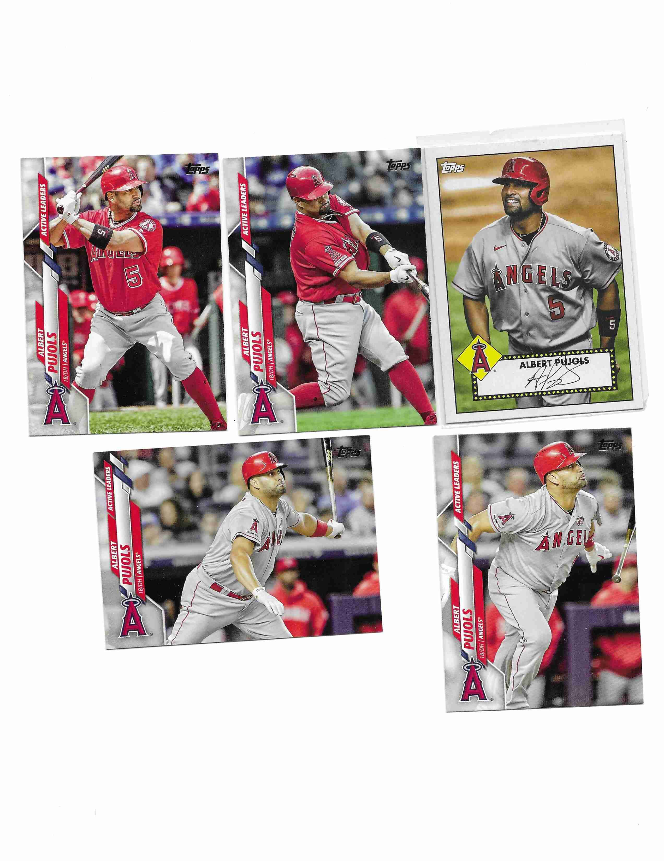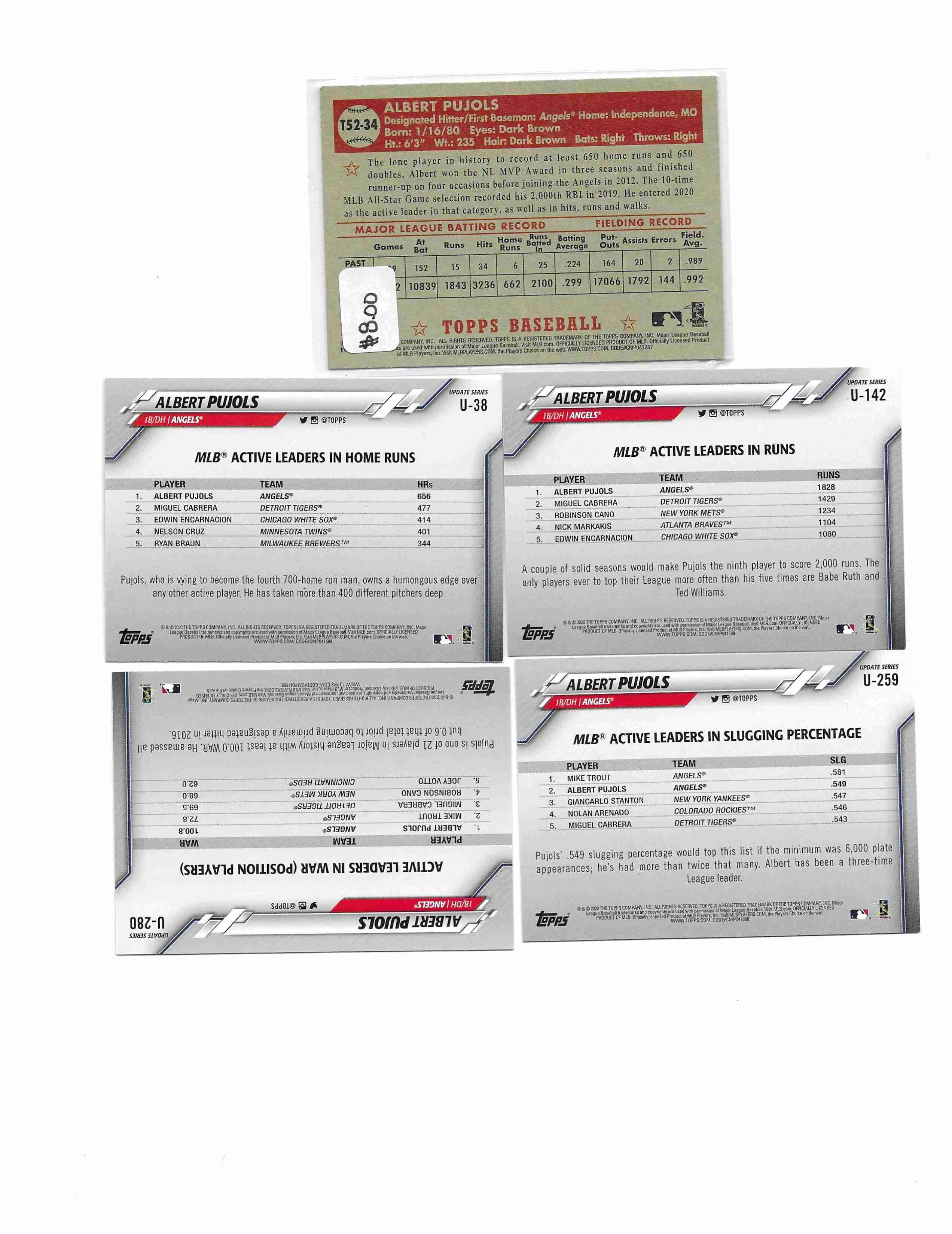2020 TOPPS #U-38, U142, U259, U280 AND 2021 T52-34 ALBERT PUJOLS. ALL CARDS IN EXCELLENT CONDITION.
