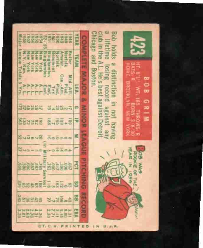 1959 Topps # 423 BOB GRIM Kansas City Athletics