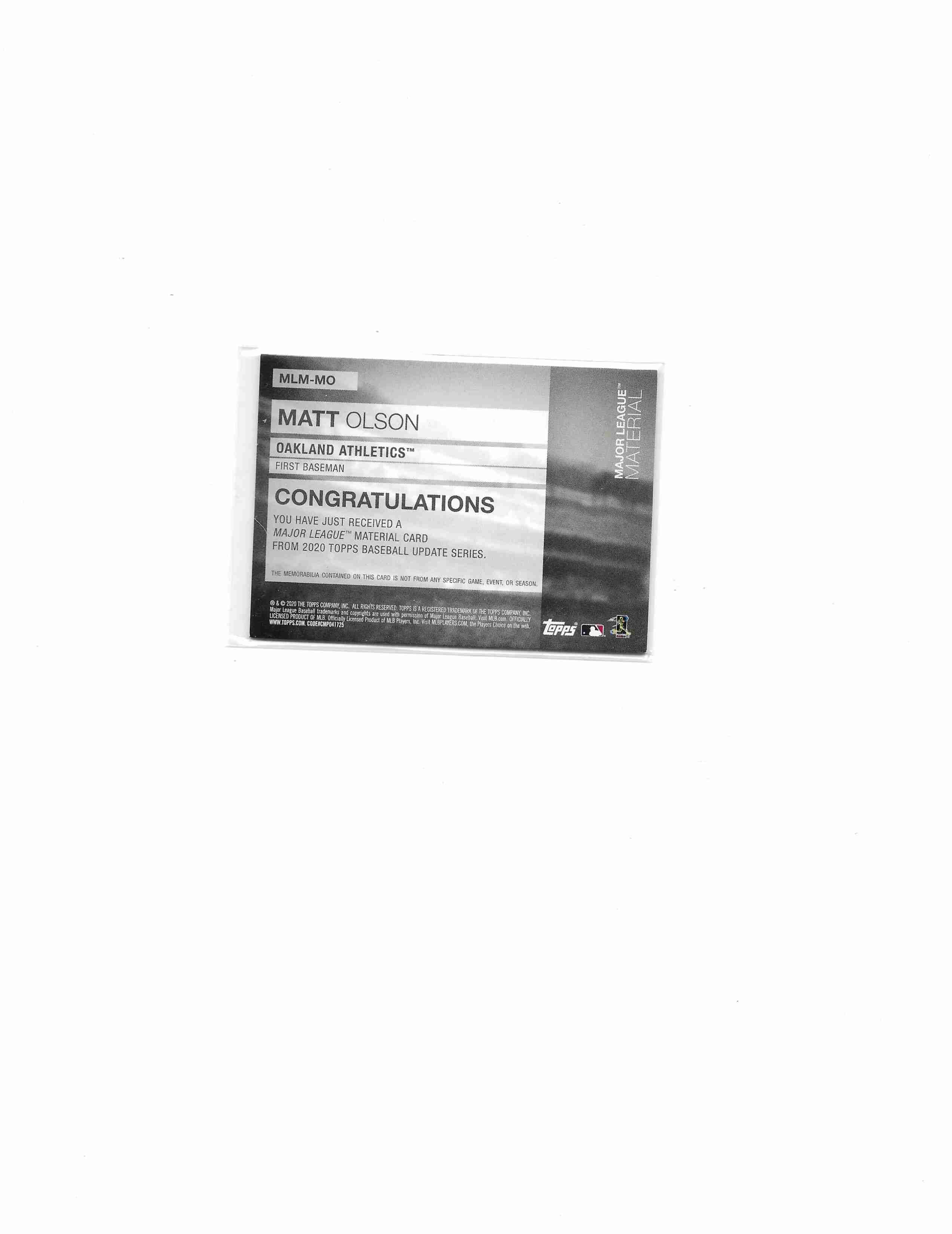2020 TOPPS MATT OLSON OAKLAND ATHLETICS JERSEY CARD #MLM-MO. CARD IN EXCELLENT CONDITON
