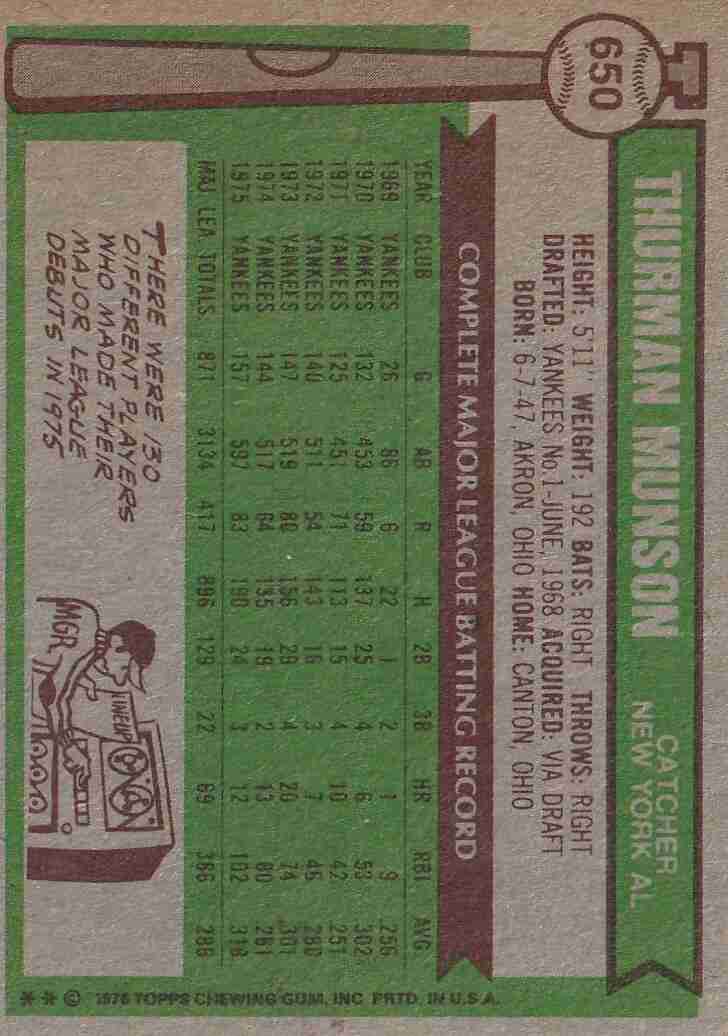 1976 Topps #650 Thurman Munson Yankees AL AS