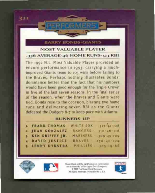 1993 Upper Deck #311 BARRY BONDS MVP Silver Signature
