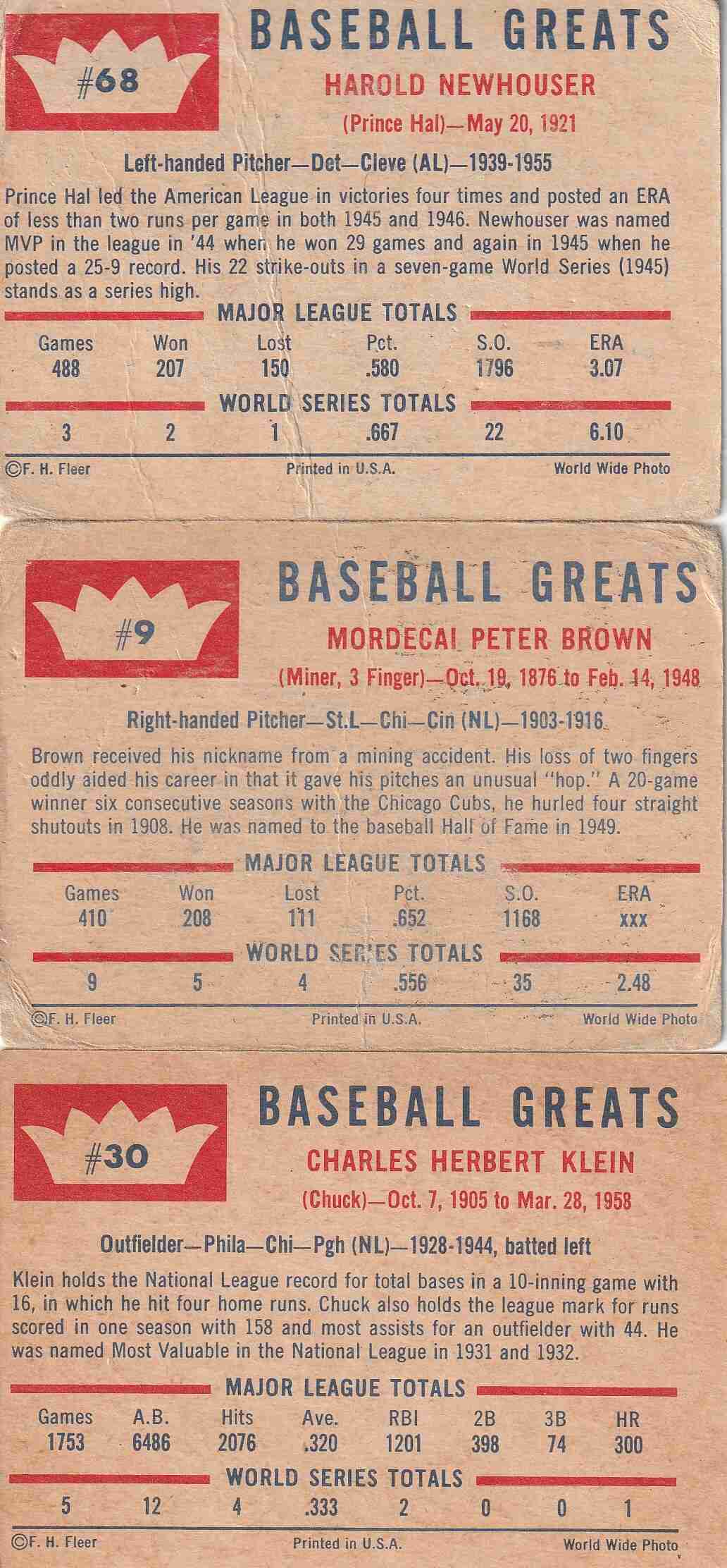 #9 Mordecai Brown (Fair-Good) #30 Chuck Klein (EX+/Better) OC ##68 Hal Newhouser (Good-VG) left to right crease thru chin//worn corners