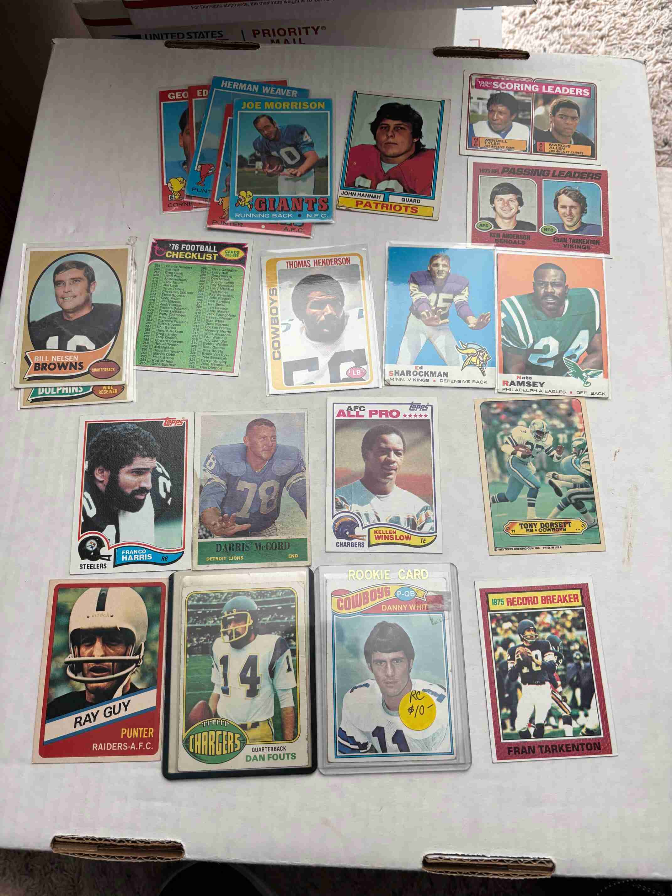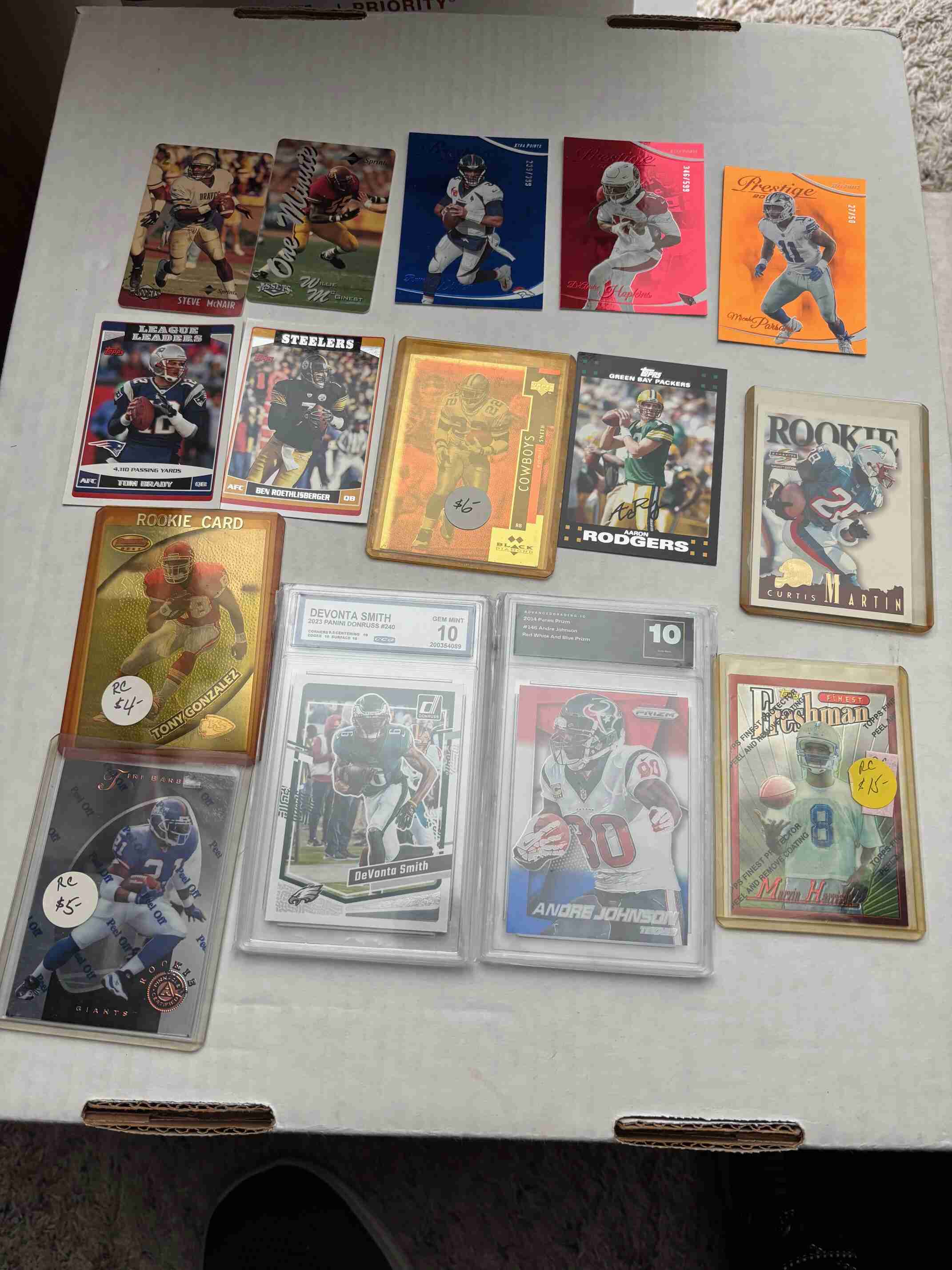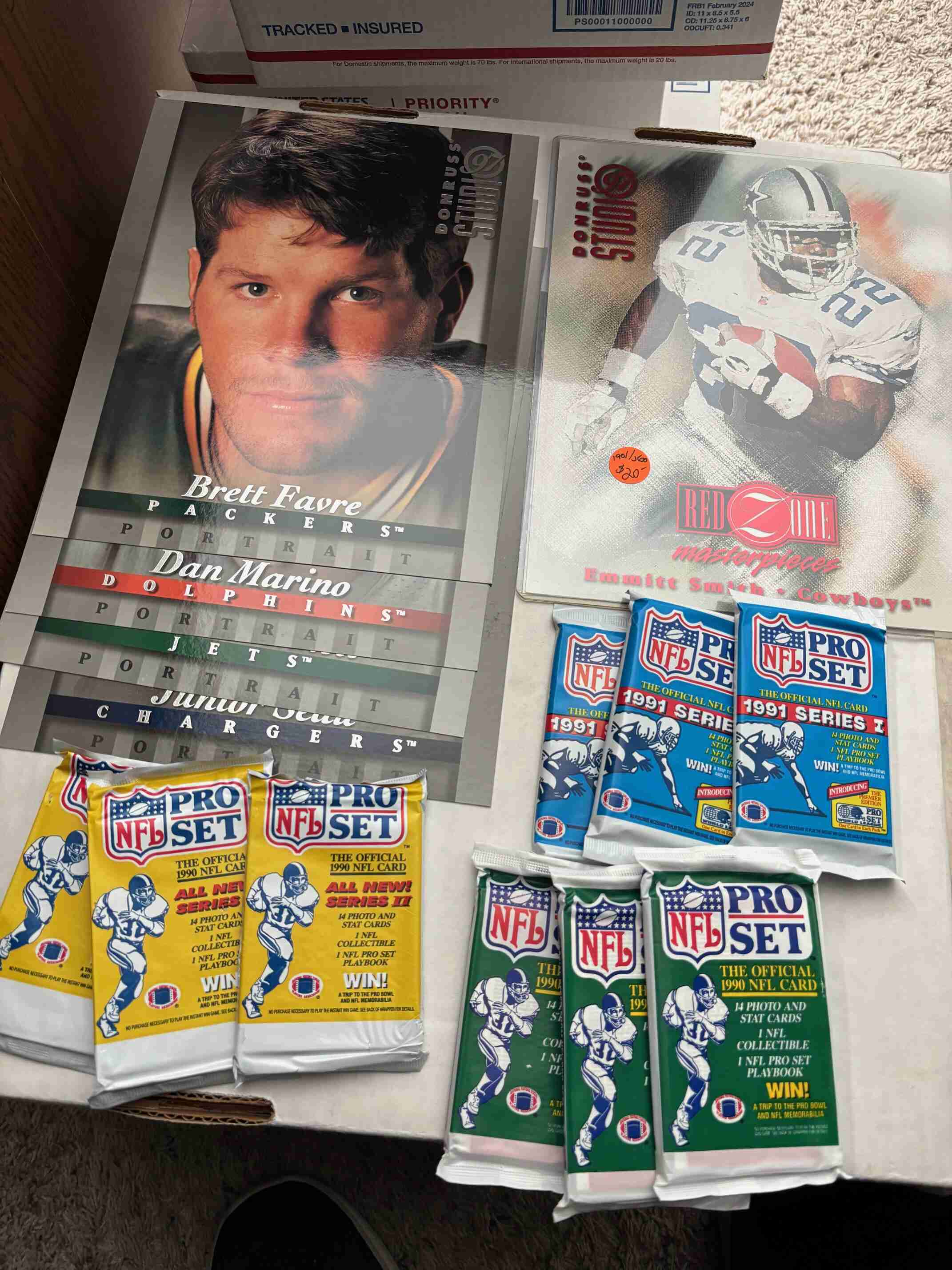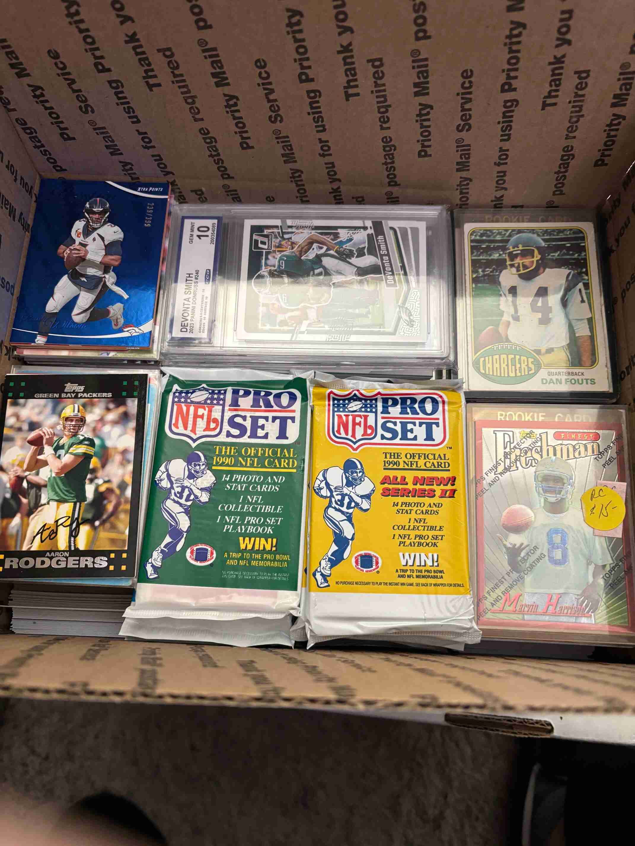 Huge clearance collection of 2500 Football cards featuring rare portrait cards with a limited print of Emmitt Snith, 2 graded 10 stars, and loaded with high value vintage, Rookies, stars, serial numbered stars, and opened packs, all in great condition. You will receive everything shown in the photos and more. I am having a complete clearance of my 2,000,000 card collection so please check out my other auctions for more great deals.