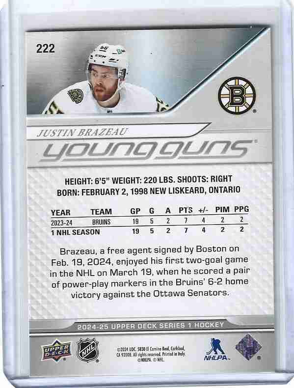 2024/25 UD 1 #222 JUSTIN BRAZEAU YOUNG GUNS