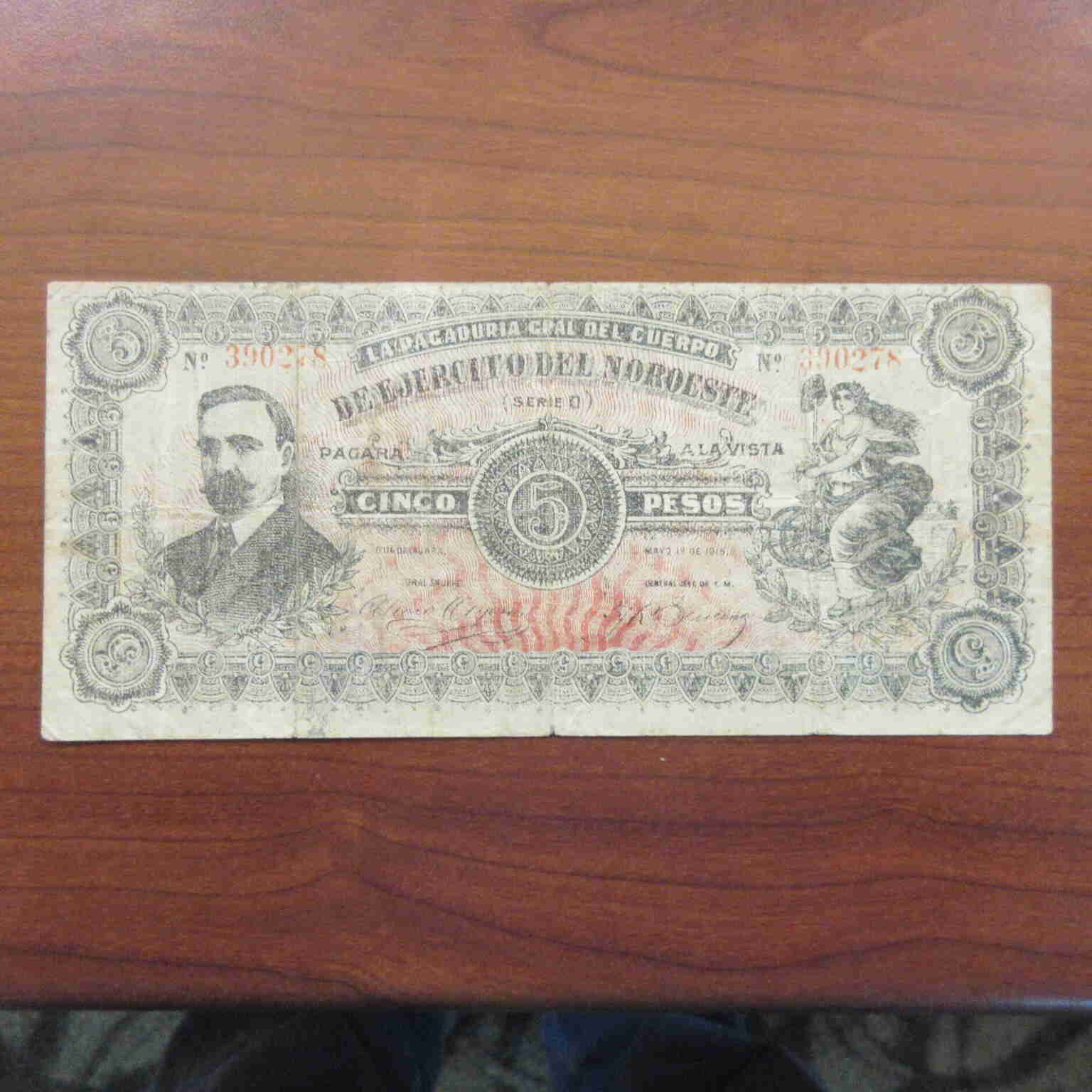 1915 Ejercito Del Noroeste 5 Pesos Note