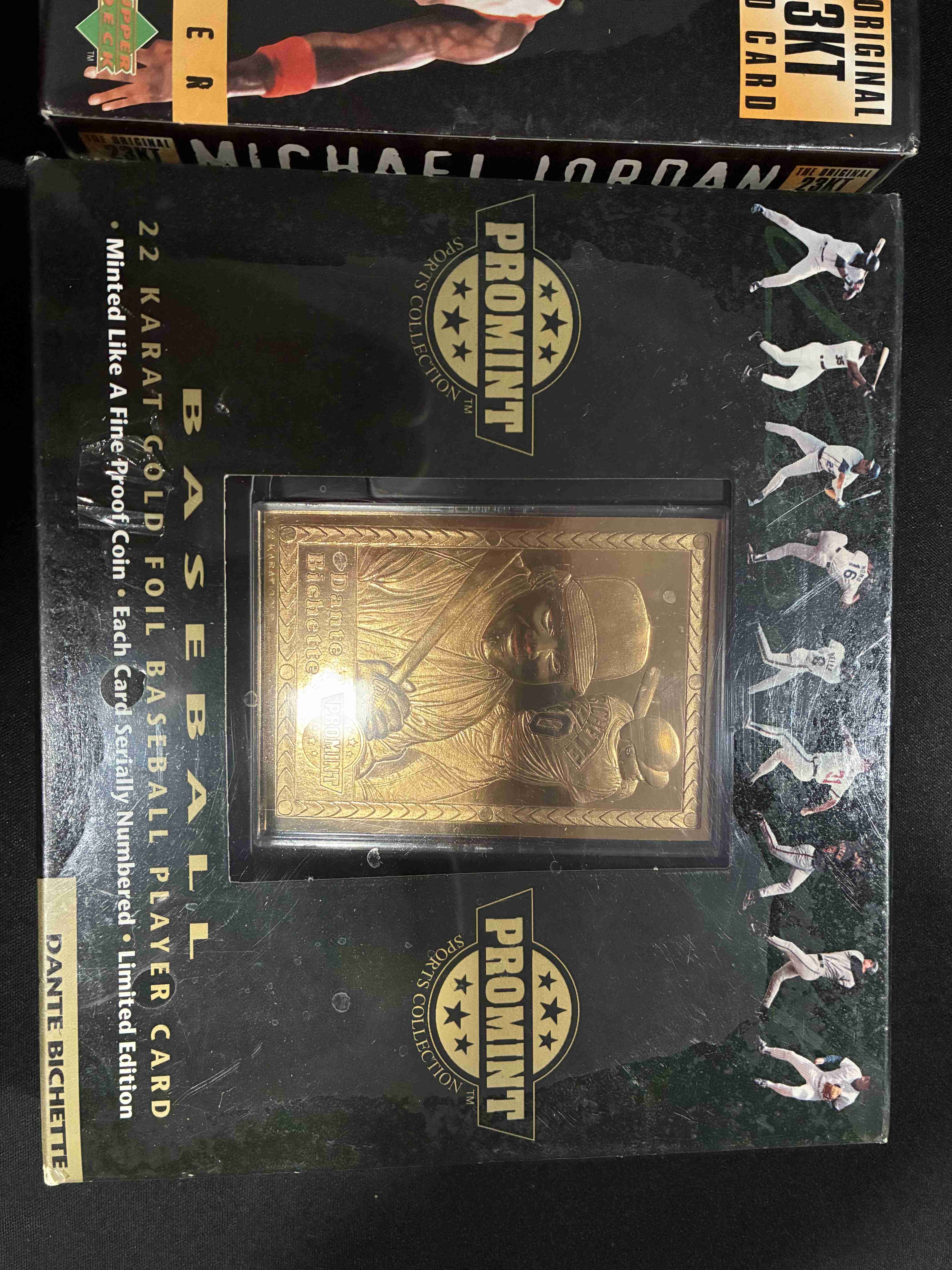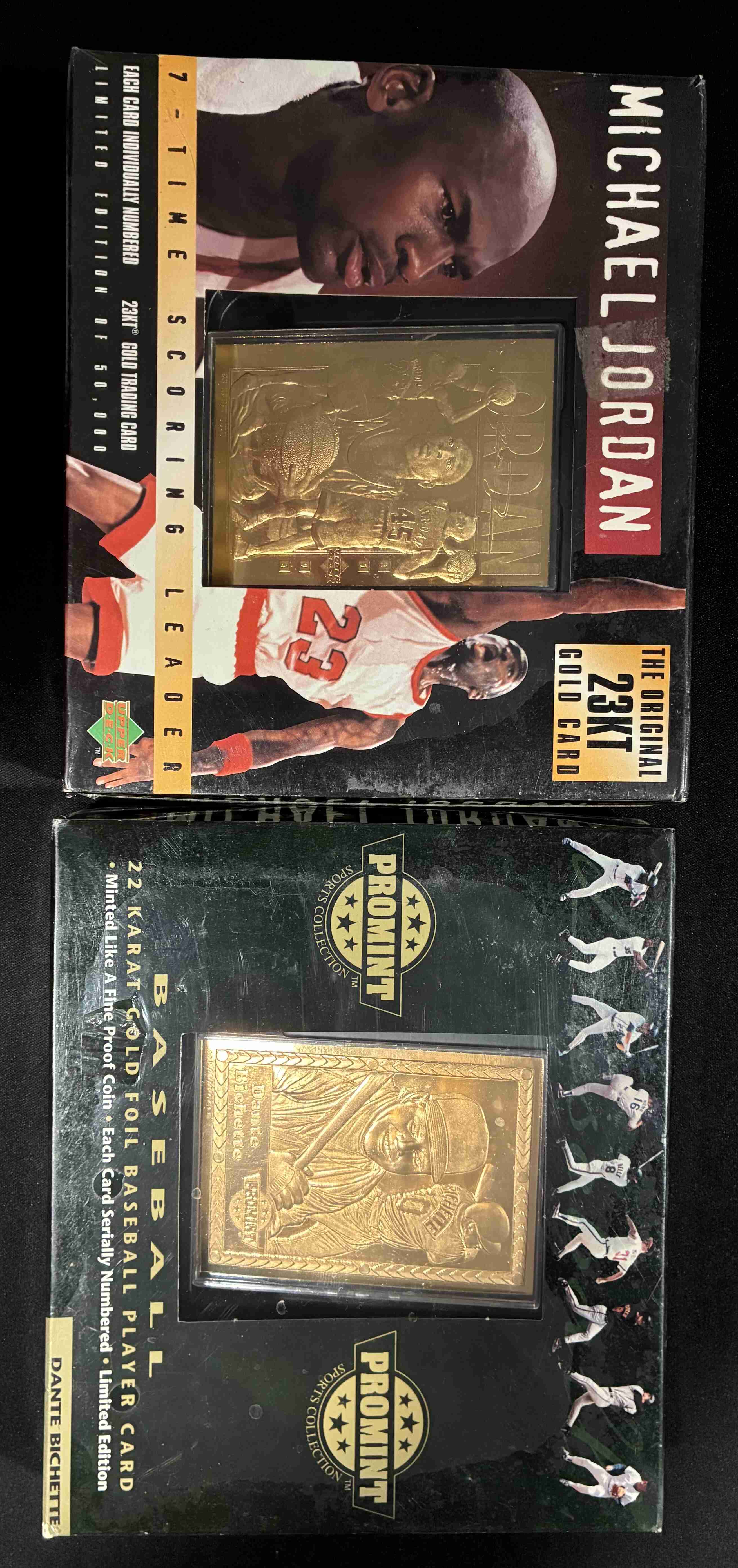 You are bidding on a pair of still sealed gold cards. The first is a 23K Gold card of Michael Jordan. This is a tough item to find still sealed, and worth a decent amount even opened. I am also throwing in a 22K sealed card of Dante Bichette as a bonus. Please let me know if you have any questions before bidding. Thank you!