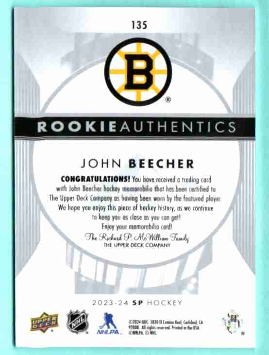 John Beecher 2023-24 Upper Deck SP Rookie Authentics Jersey #135