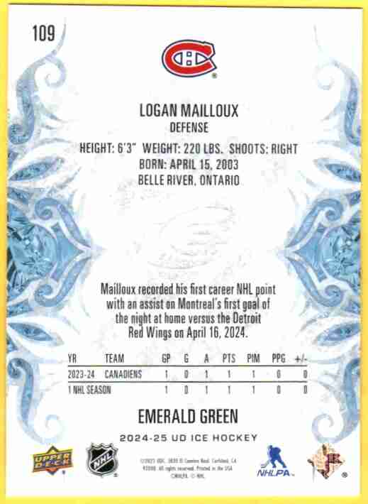 Logan Mailloux [Emerald Green] #109 2024 Upper Deck Ice