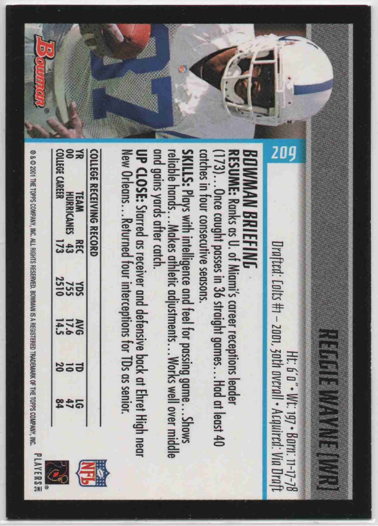 Reggie Wayne 2001 Bowman #209 Gold Parallel Rookie SP