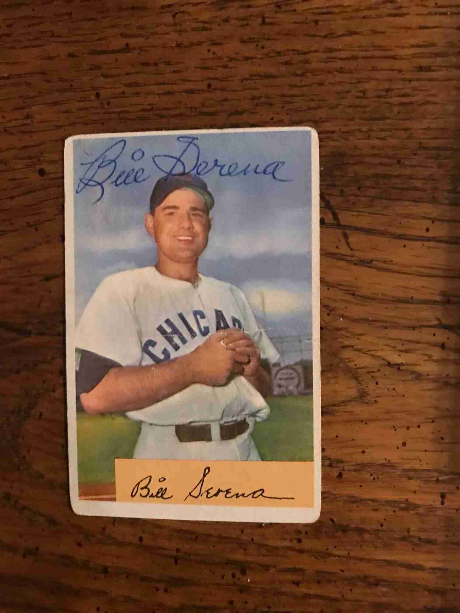 Bill Serena Hand signed autograph on a 1954 Bowman Baseball Card. Card is fair to good condition and autograph is excellent.