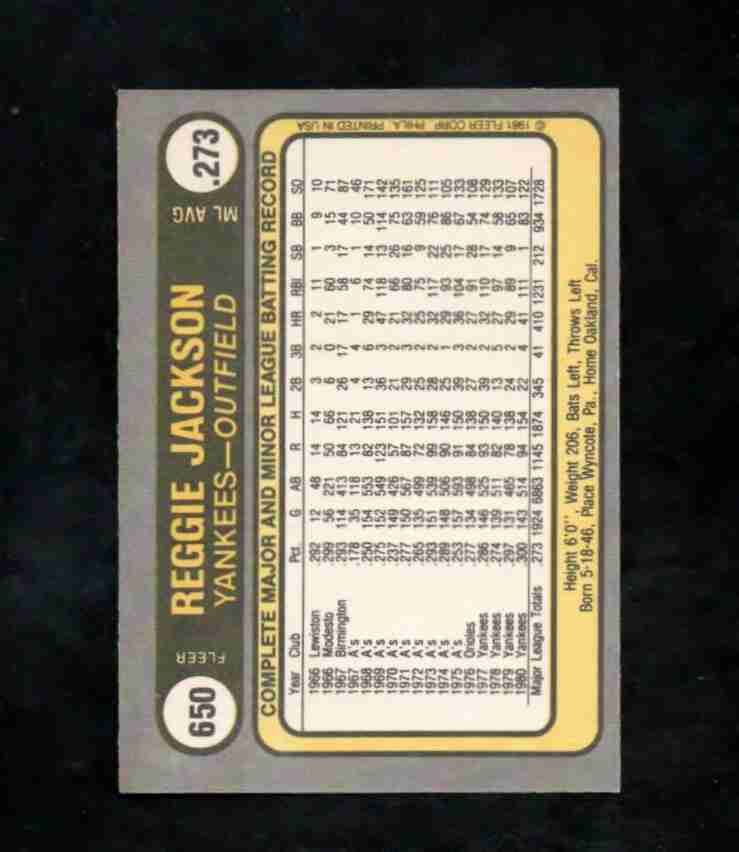 1981 Fleer # 650 REGGIE JACKSON Yankees