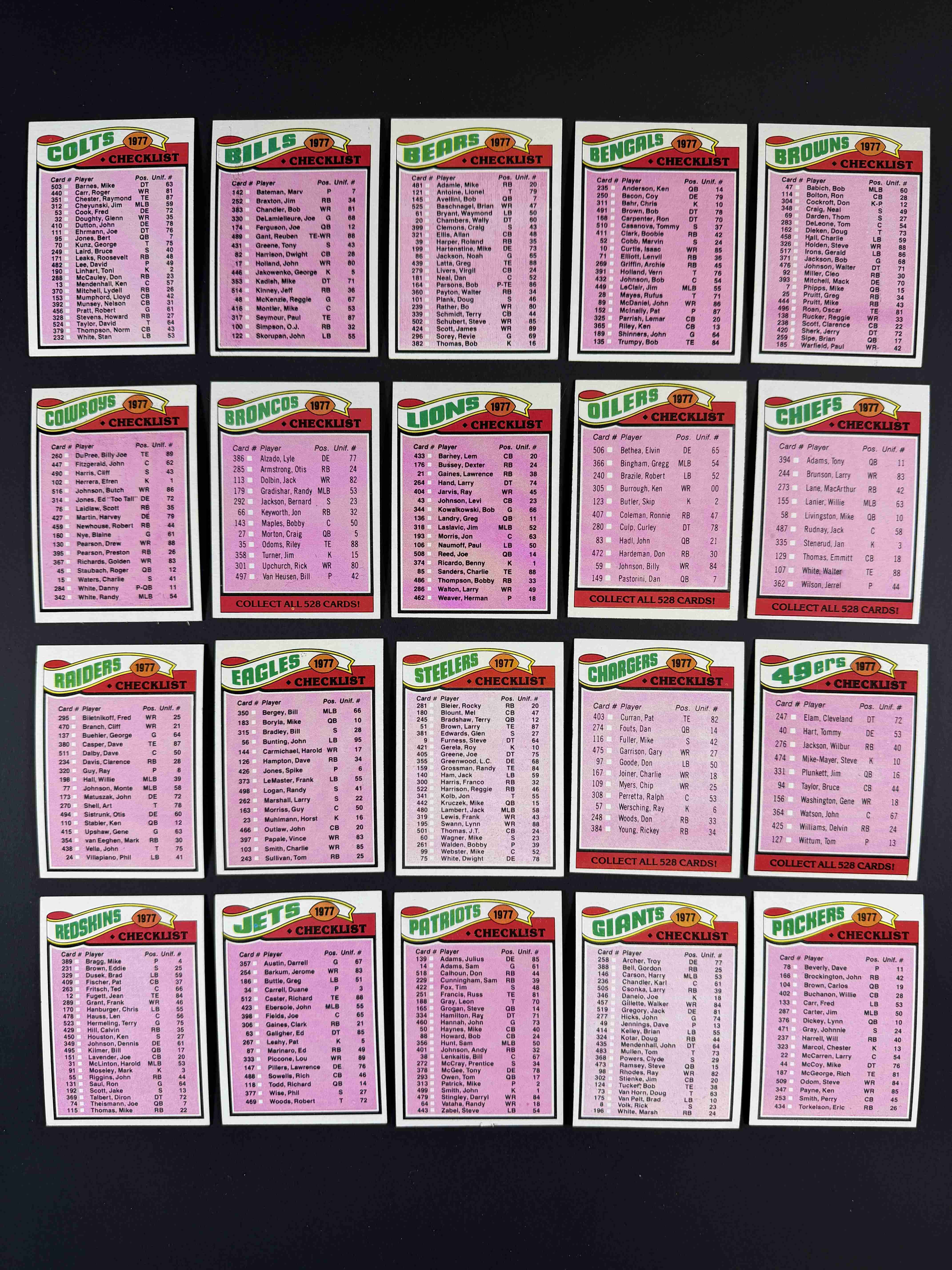 20 different 1977 Topps Football Team Checklists. High grade in NM to MINT condition. Unmarked beautiful examples of these cards. Some great teams from that era, like the Dallas Cowboys, Washington Redskins, Oakland Raiders, Pittsburgh Steelers and Chicago Bears.