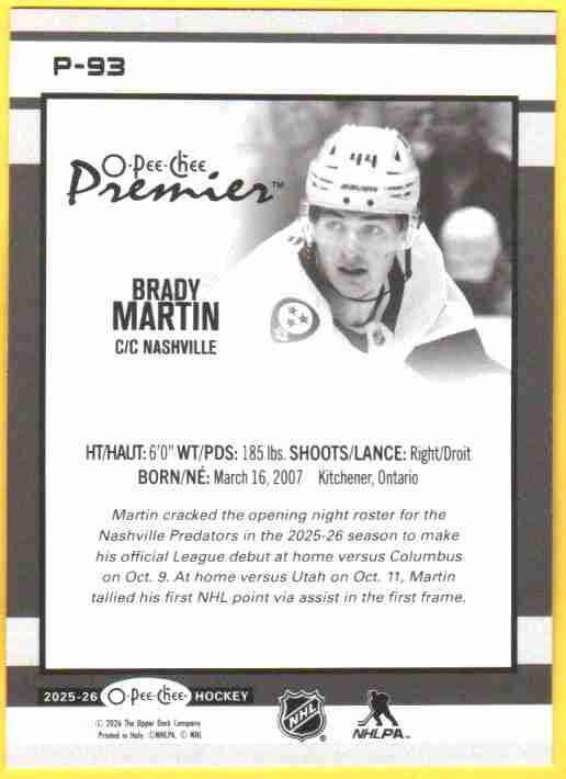Brady Martin #P-93 2025 O-Pee-Chee Premier RC