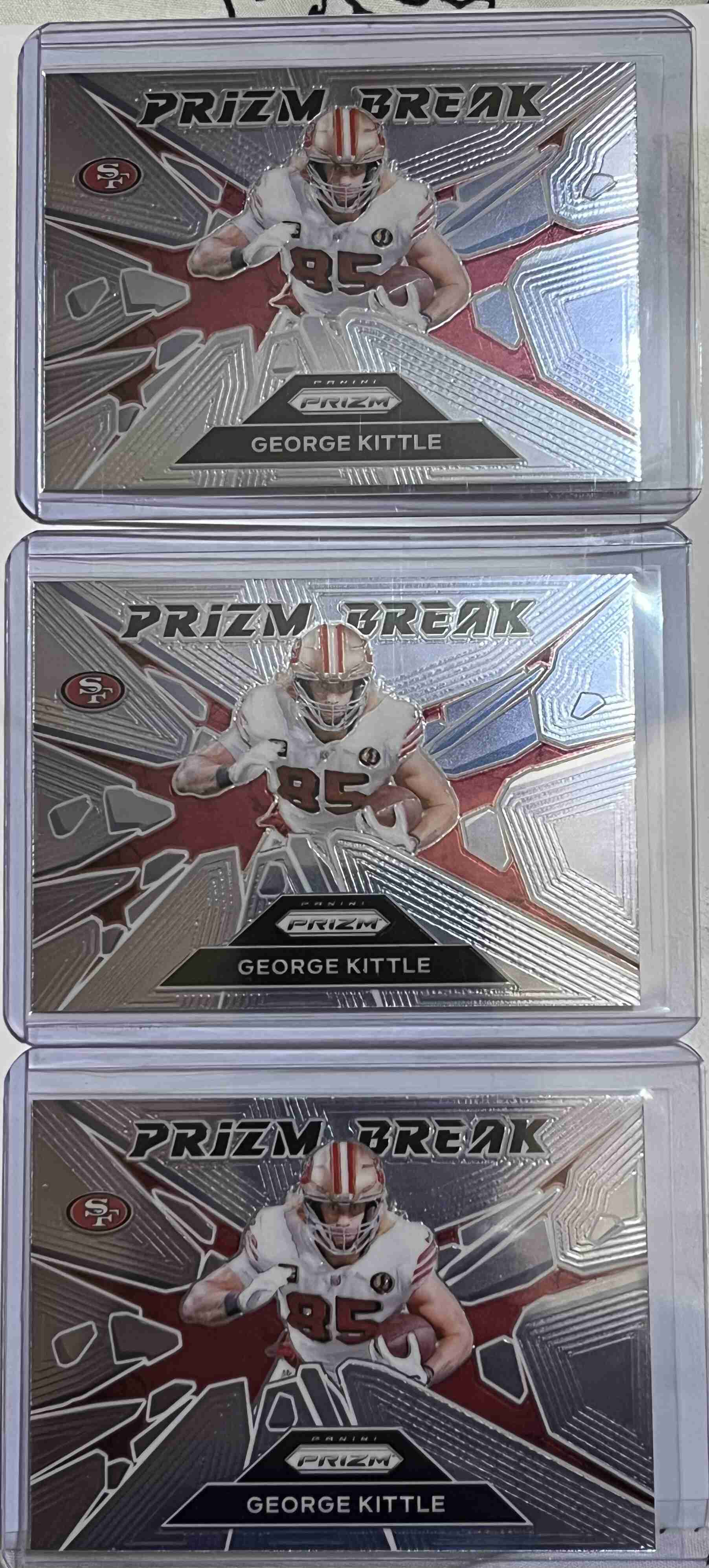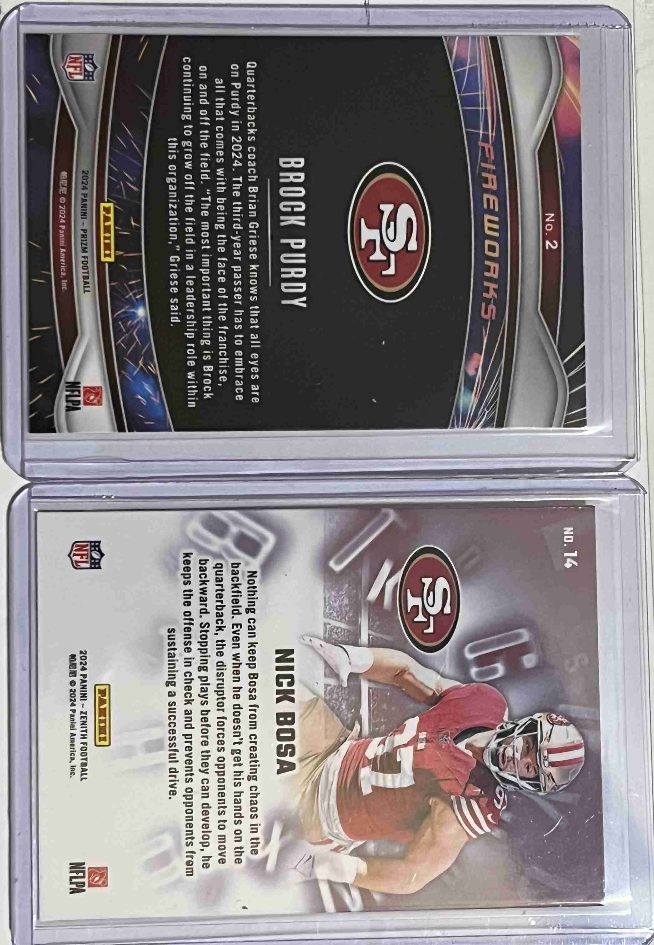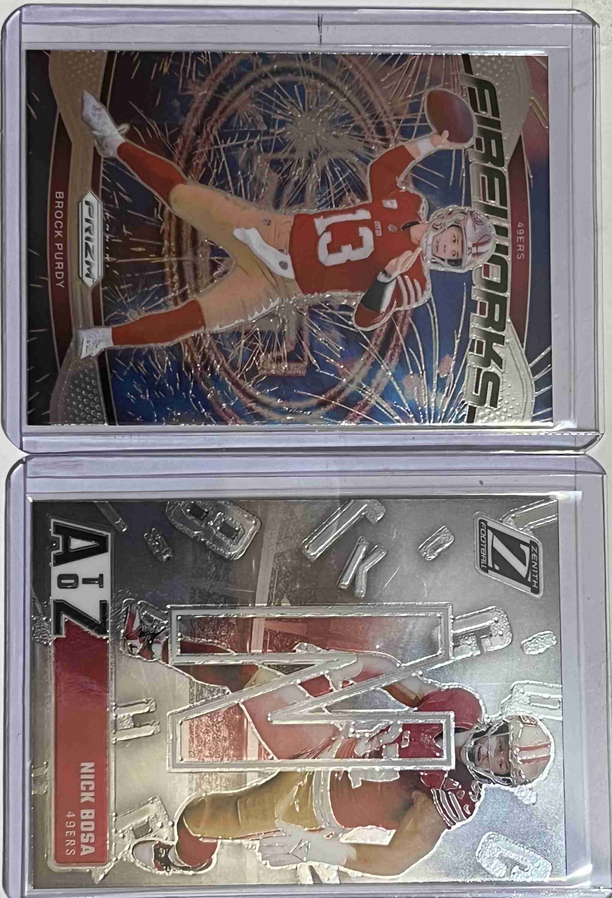 Three 2024 Panini Prizm Prizm Break 2 George Kittle 2024 Panini Prizm Fireworks 2 Brock Purdy 2024 Panini Zenith A to Z 14 Nick Bosa